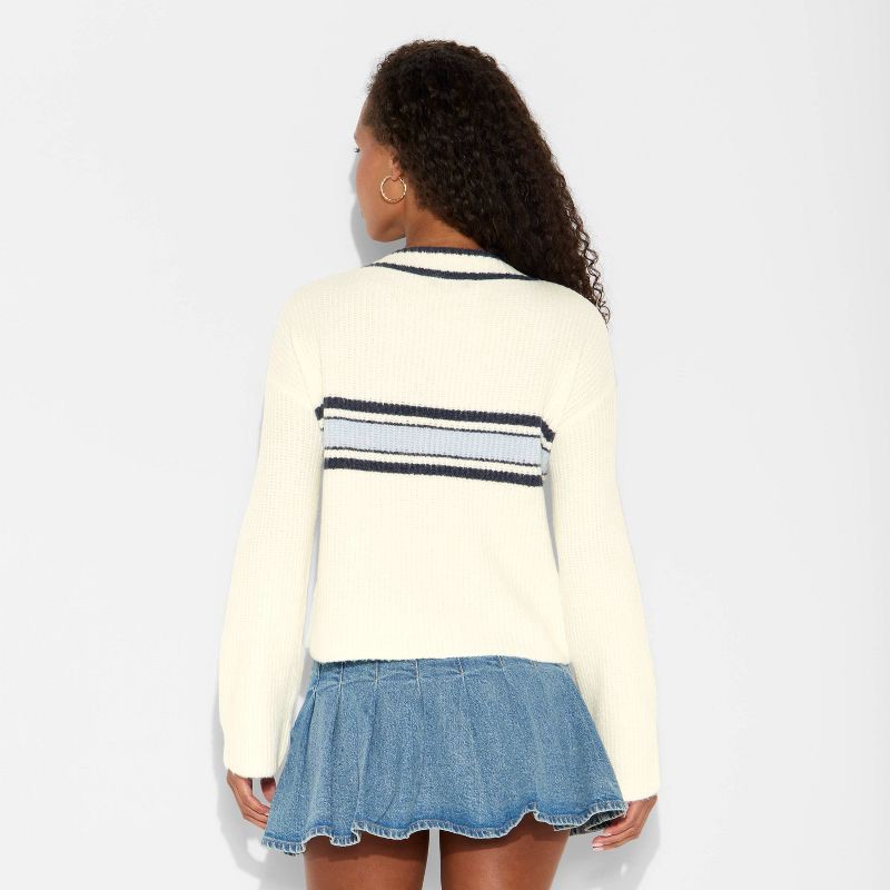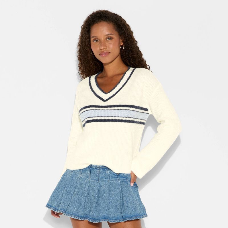 Women's V-Neck Pullover Sweater - Wild Fable™ Off-White Rugby Striped M