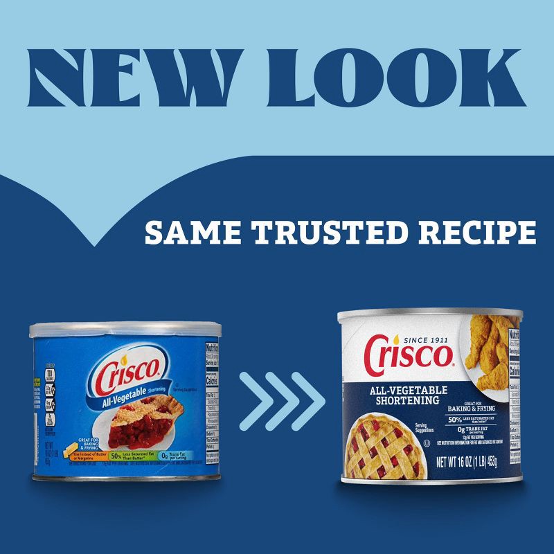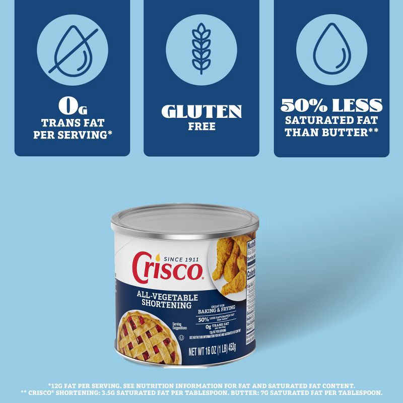- Crisco All-Vegetable Shortening for baking easily replaces butter or margarine in baked goods
