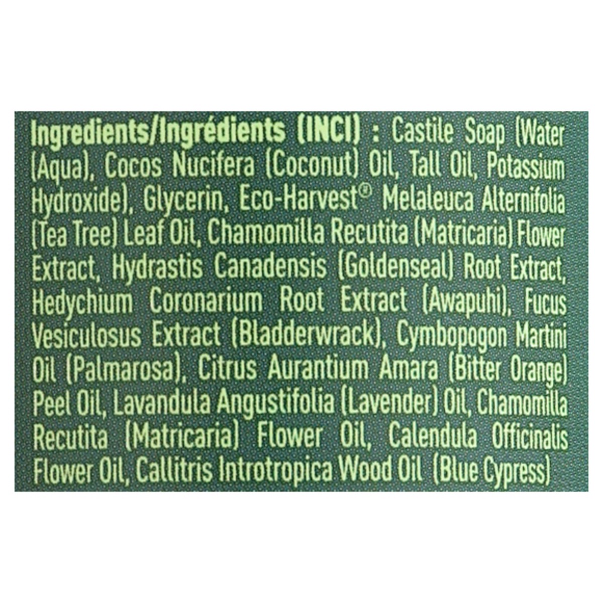 Castile Soap (Water (Aqua), Cocos Nucifera (Coconut) Oil, Tall Oil, Potassium Hydroxide), Glycerin, Eco-Harvest Melaleuca Alternifolia (Tea Tree) Leaf Oil, Chamomilla Recutita (Matricaria) Flower Extr…