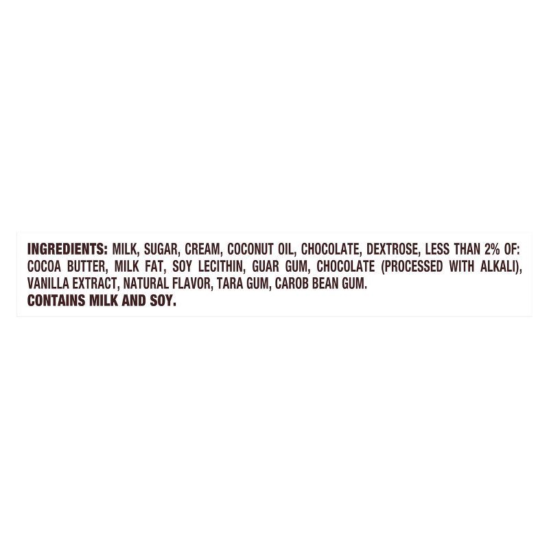 Milk, Sugar, Cream, Coconut Oil, Chocolate, Dextrose, Less Than 2% of: Cocoa Butter, Milk Fat, Soy Lecithin, Guar Gum, Chocolate (Processed with Alkali), Vanilla Extract, Natural Flavor, Tara Gum, Car…