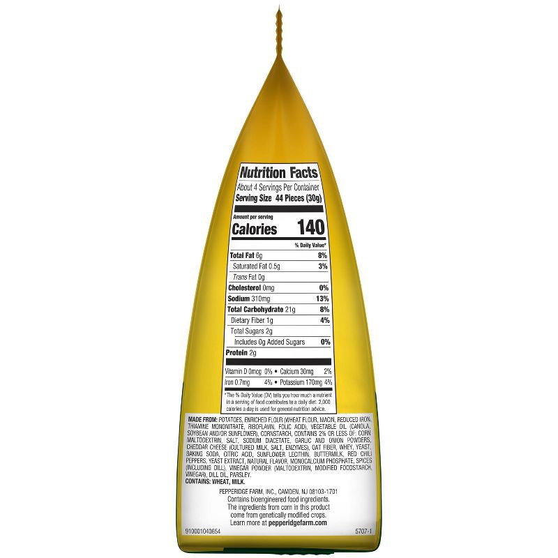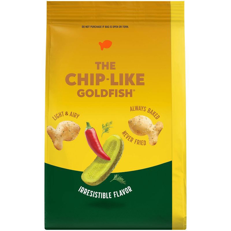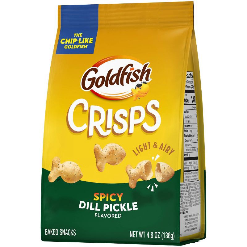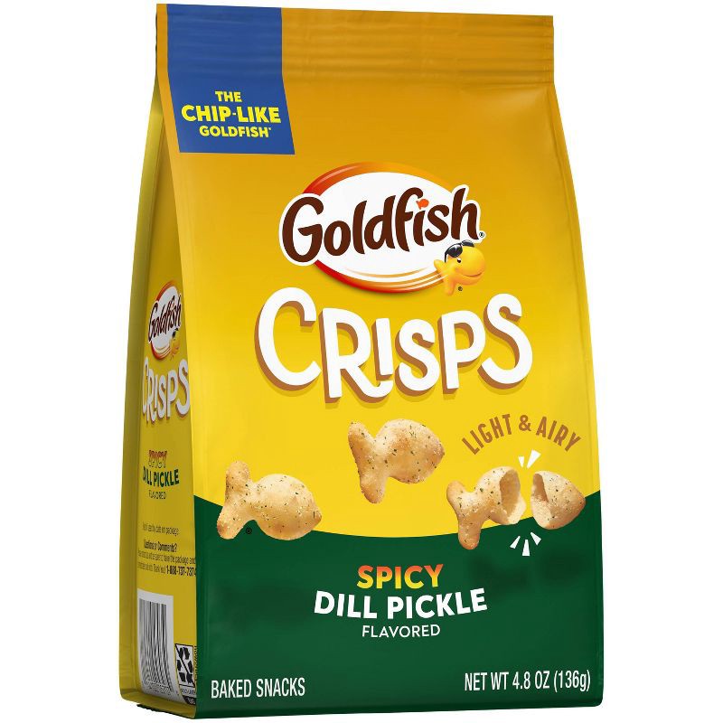 - Includes one (1) 4.8-ounce bag of Goldfish® Crisps Spicy Dill Pickle Flavored Baked Chip Crackers