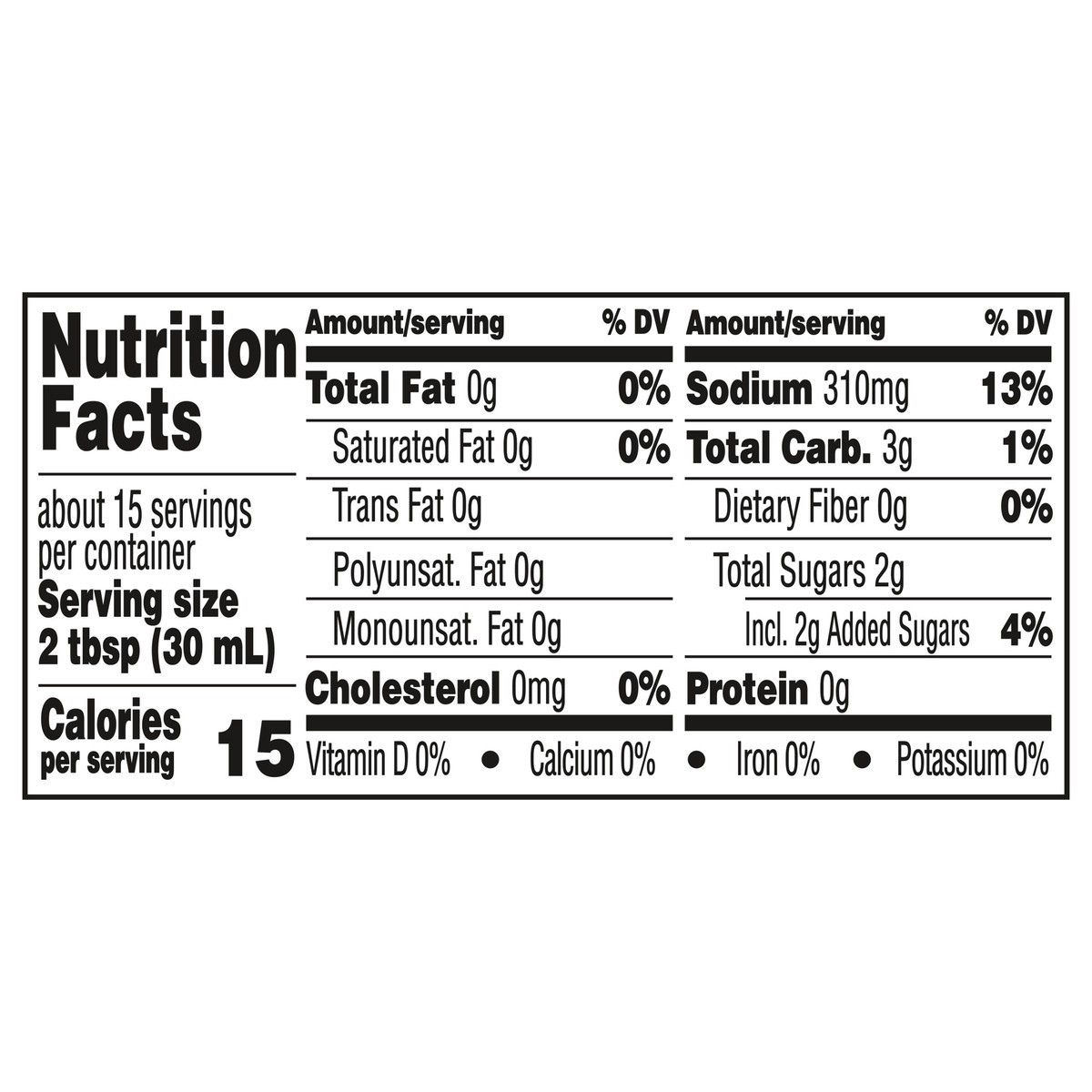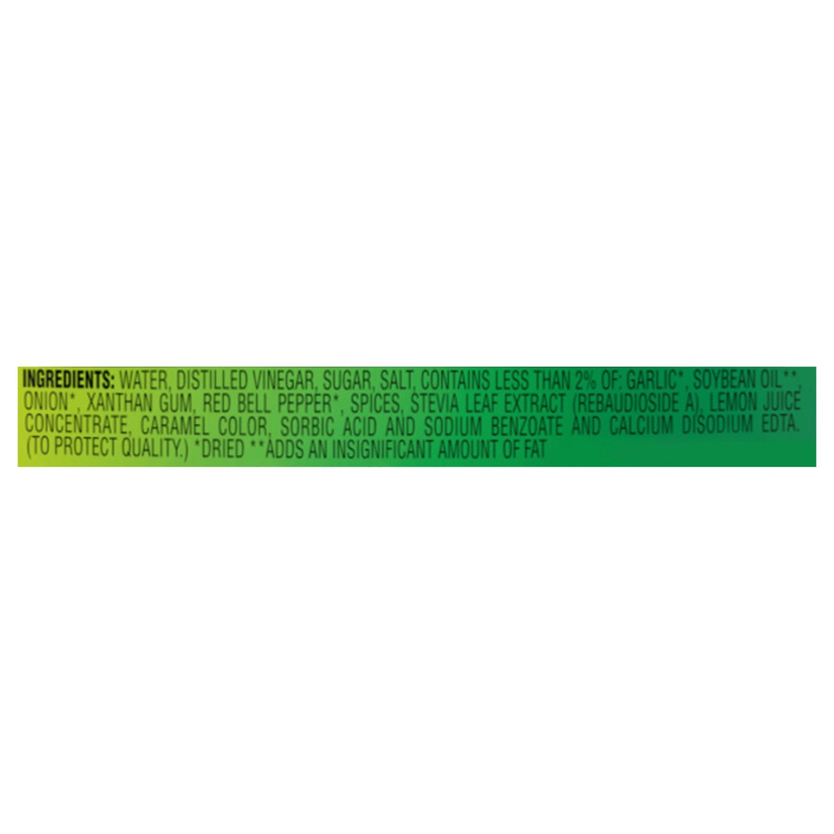Water, Distilled Vinegar, Sugar, Salt, Contains Less than 2% of: Garlic*, Soybean Oil**, Onion*, Xanthan Gum, Red Bell Pepper*, Spices, Stevia Leaf Extract (Rebaudioside a), Lemon Juice Concentrate, C…