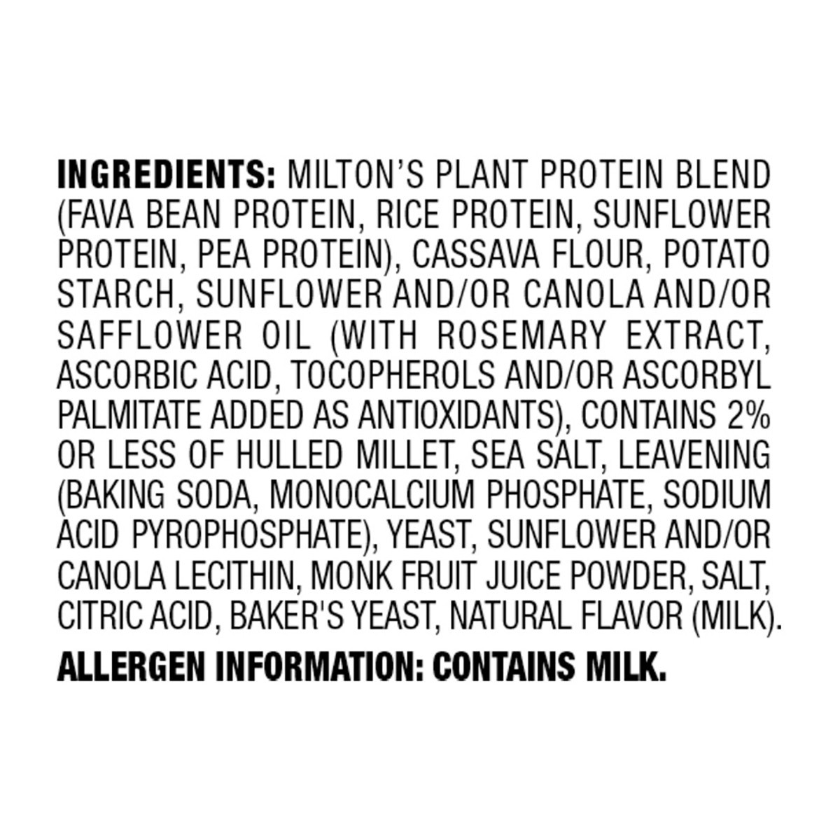 Milton's Plant Protein Blend (Fava Bean Protein, Rice Protein, Sunflower Protein, Pea Protein), Cassava Flour, Potato Starch, Sunflower and/or Canola and/or Safflower Oil (with Rosemary Extract, Ascor…