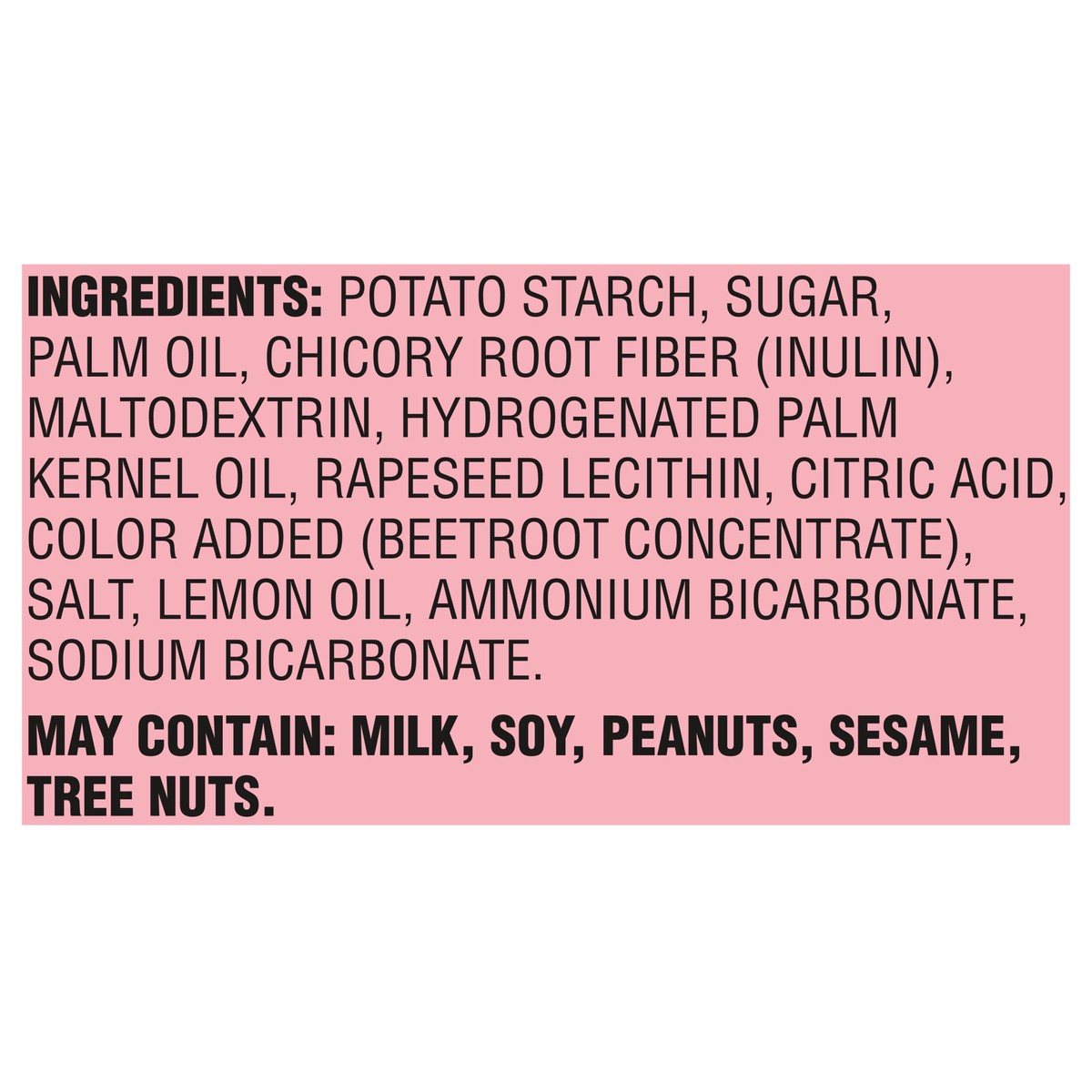 Potato Starch, Sugar, Palm Oil, Chicory Root Fiber (Inulin), Maltodextrin, Hydrogenated Palm Kernel Oil, Rapeseed Lecithin, Citric Acid, Color Added (Beetroot Concentrate), Salt, Lemon Oil, Ammonium B…