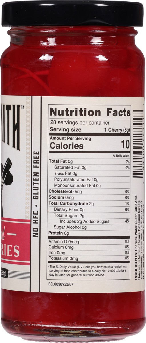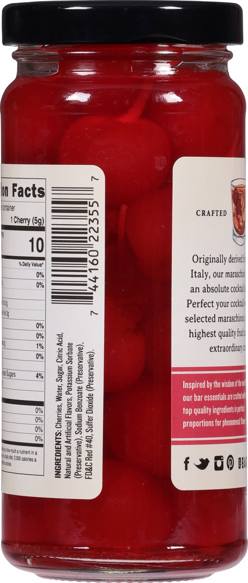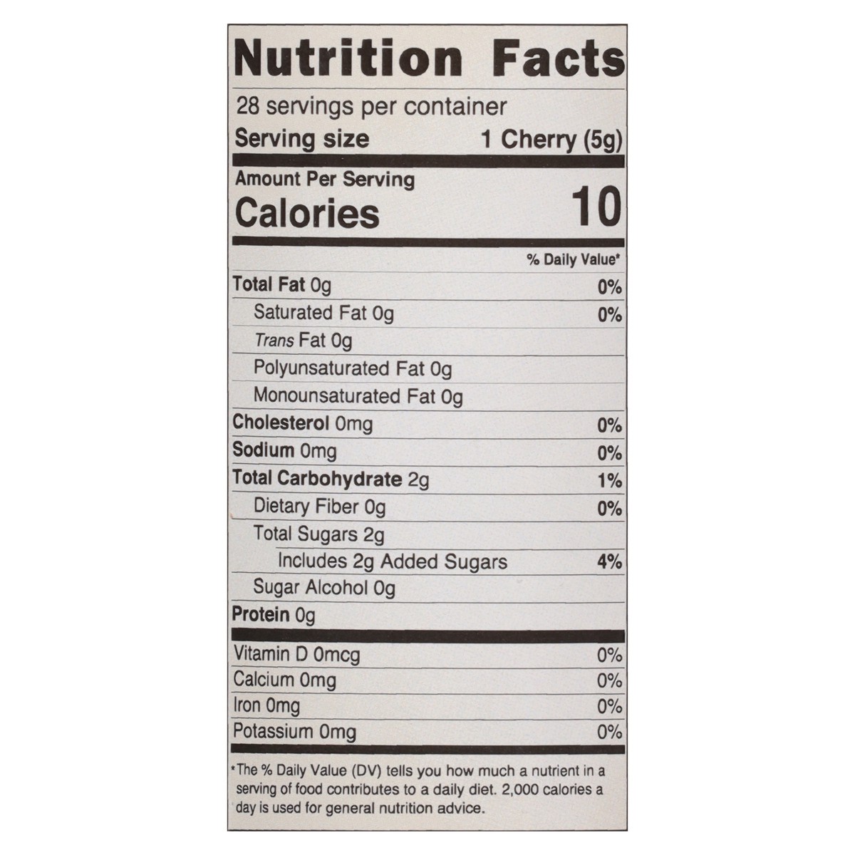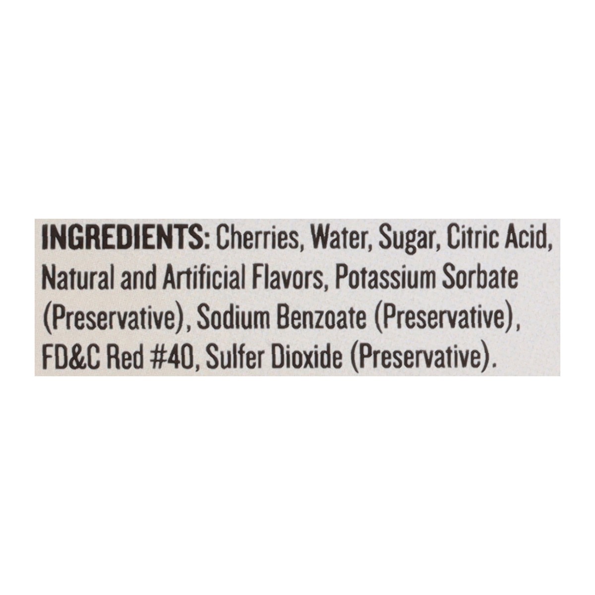 Cherries, Water, Sugar, Citric Acid, Natural and Artificial Flavors, Potassium Sorbate (Preservative), Sodium Benzoate (Preservative), FD&C Red 40, Sulfer Dioxide (Preservative).