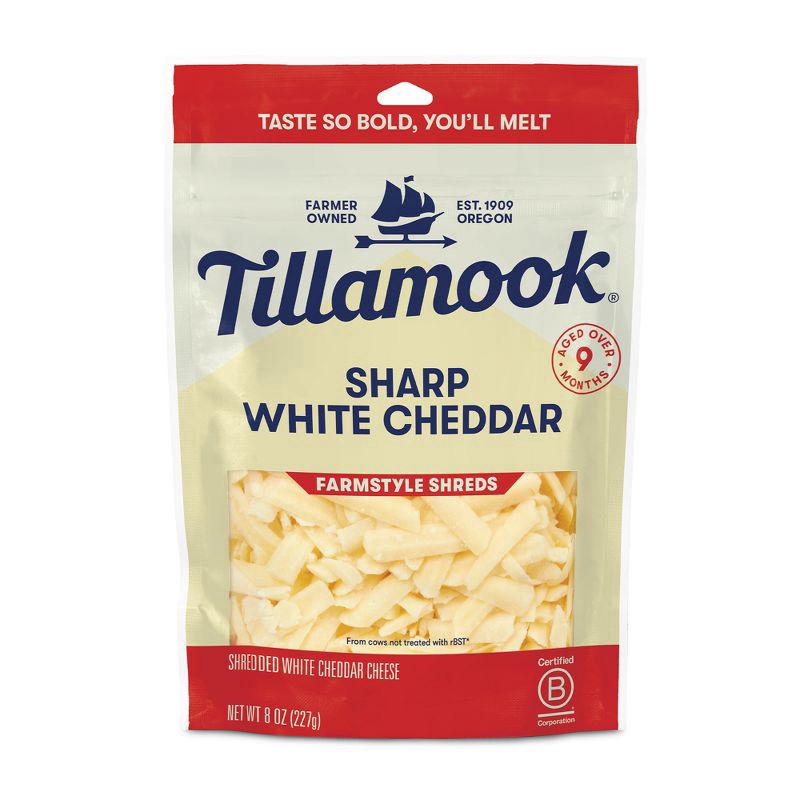 - One 8 oz bag of Tillamook Farmstyle Sharp White Cheddar Shredded Cheese