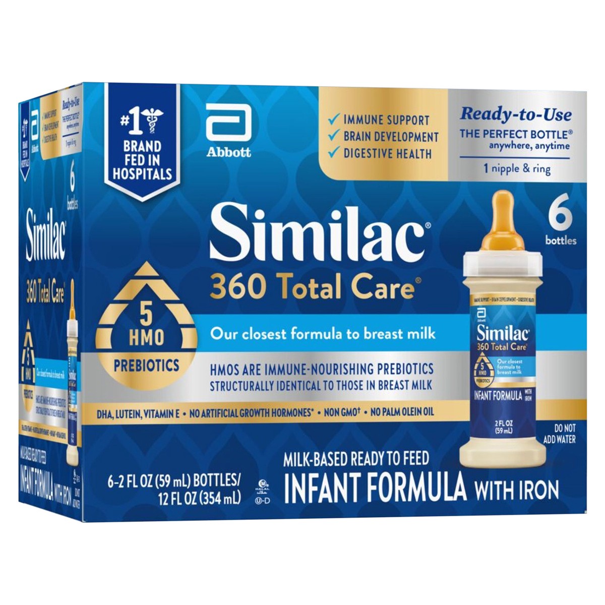 No. 1 brand fed in hospitals. Immune support. Brain development. Digestive health. Ready-to-use. The perfect bottle anywhere, anytime. 1 Nipple & ring. Our closest formula to breast milk. 5 HMO prebio…