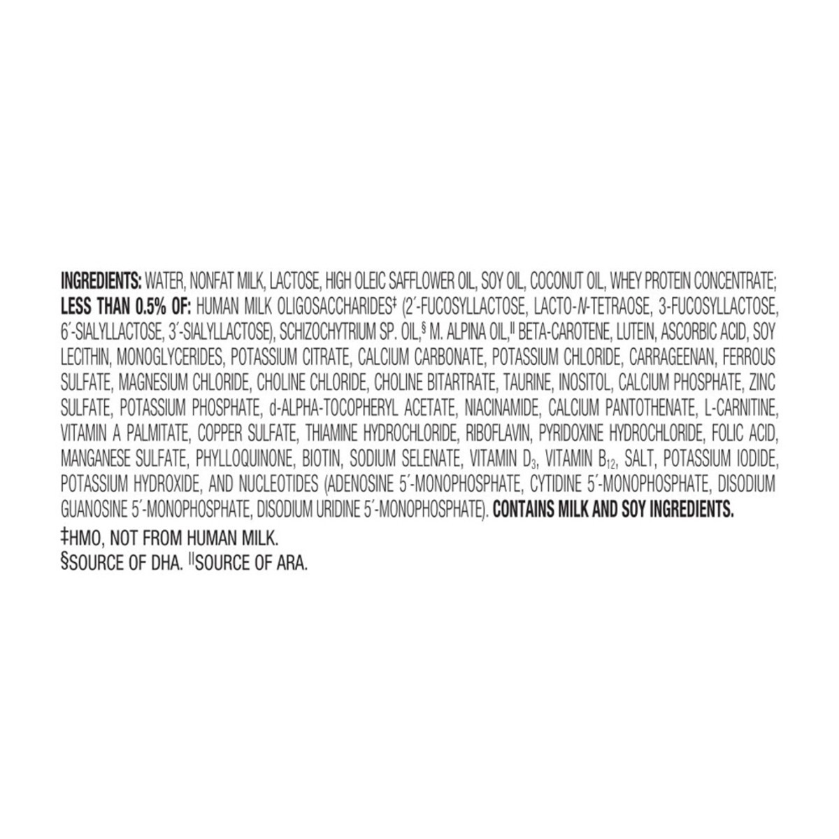 Water, Nonfat Milk, Lactose, High Oleic Safflower Oil, Soy Oil, Coconut Oil, Whey Protein Concentrate; Less than 0.5% of: Human Milk Oligosaccharides (HMO, Not for Human Milk) (2-Fucosyllactose, Lacto…