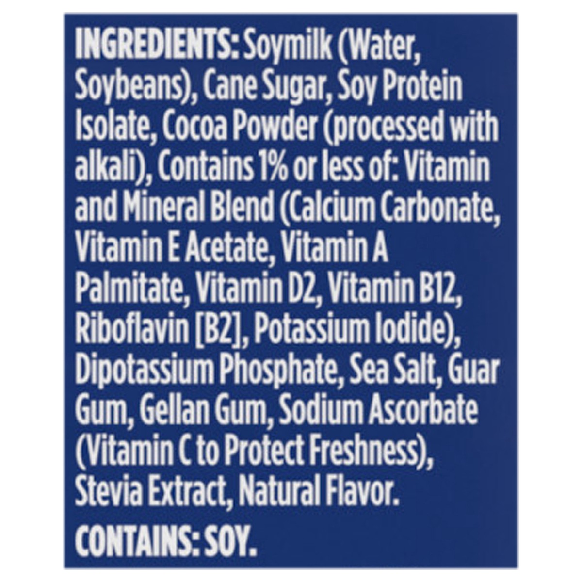 Soymilk (Water, Soybeans), Cane Sugar, Soy Protein Isolate, Cocoa Powder (processed with alkali), Contains 1% or less of: Vitamin and Mineral Blend (Calcium Carbonate, Vitamin E Acetate, Vitamin A Pal…