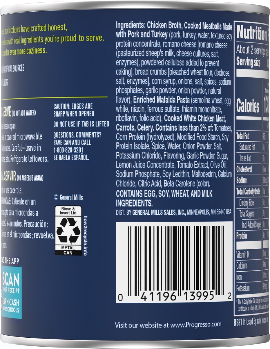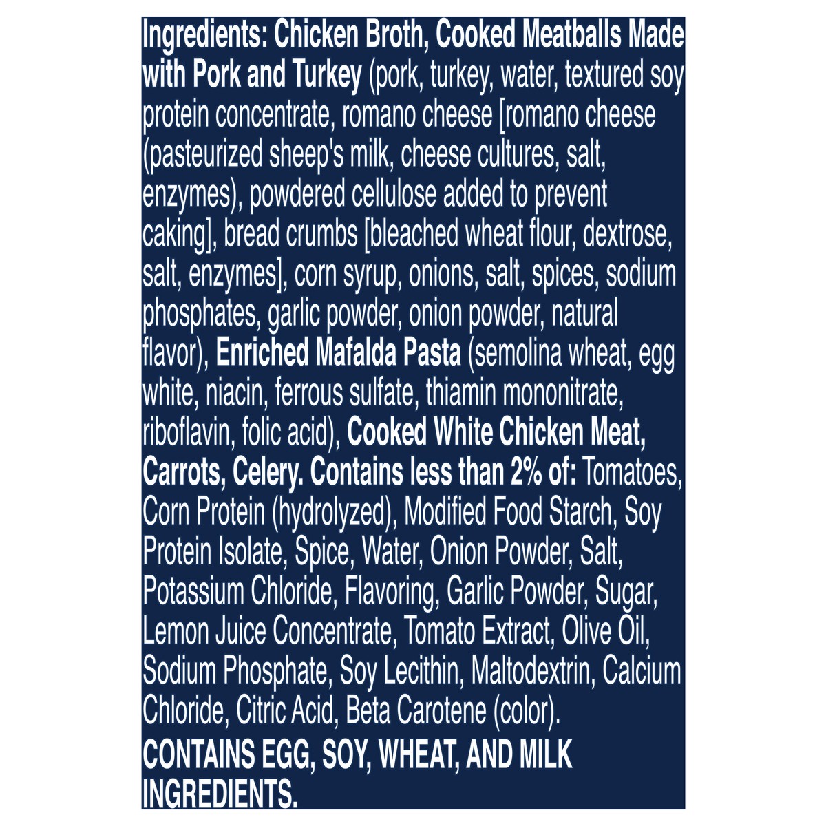 Chicken Broth, Cooked Meatballs Made with Pork and Turkey (Pork, Turkey, Water, Textured Soy Protein Concentrate, Romano Cheese [Romano Cheese (Pasteurized Sheep's Milk, Cheese Cultures, Salt, Enzymes…