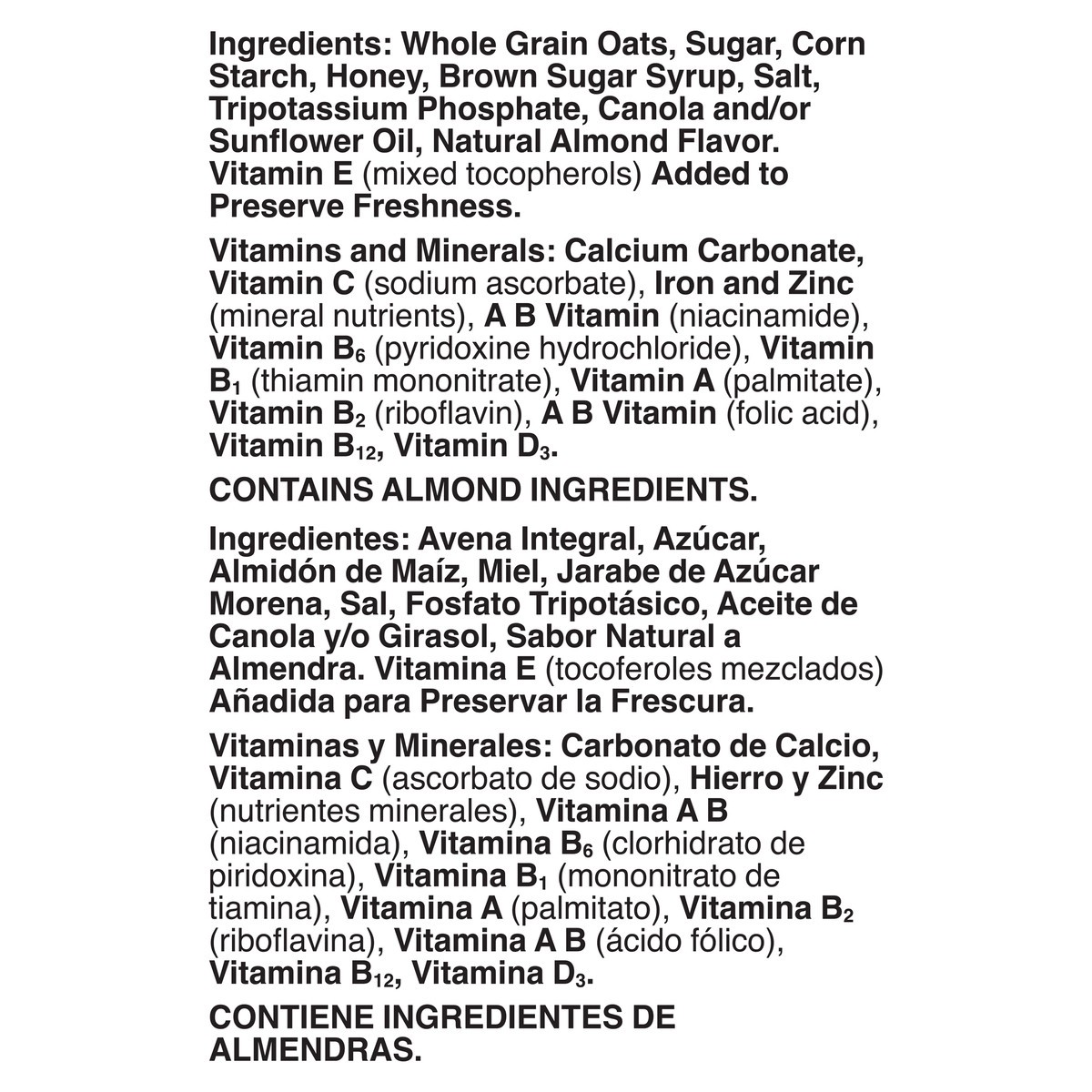 Whole Grain Oats, Sugar, Corn Starch, Honey, Brown Sugar Syrup, Salt, Tripotassium Phosphate, Canola and/or Sunflower Oil, Natural Almond Flavor, Vitamin E (Mixed Tocopherols) Added to Preserve Freshn…