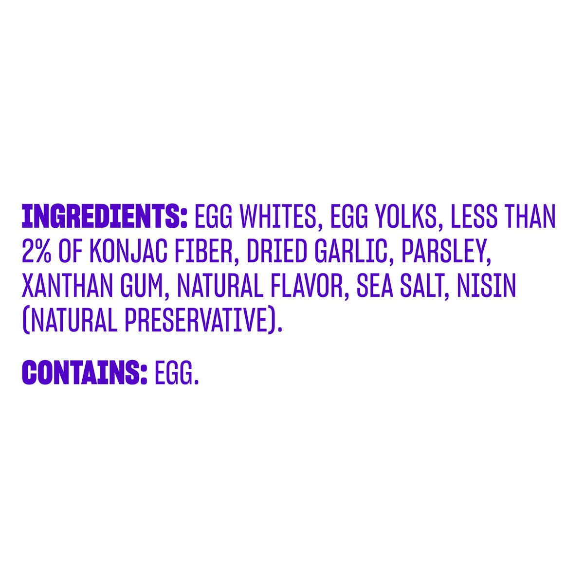 Egg Whites, Egg Yolks, Less than 2% of Konjac Fiber, Dried Garlic, Parsley, Xanthan Gum, Natural Flavor, Sea Salt, Nisin (Natural Preservative).