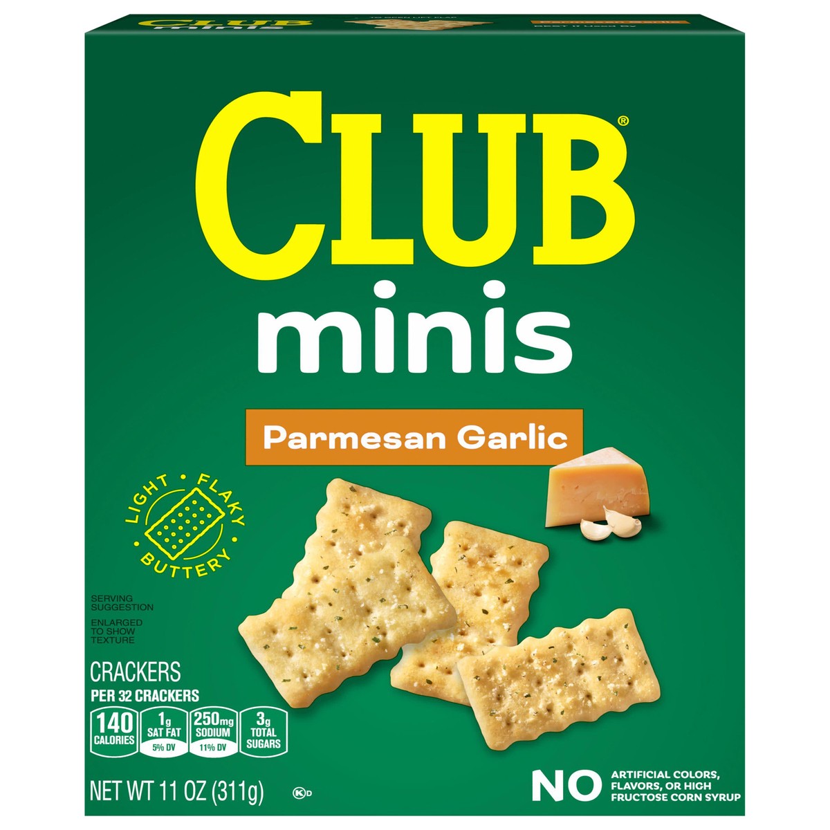 - 11oz box of ready-to-eat Club Minis Parmesan Garlic crackers; Packaged for freshness and great taste
