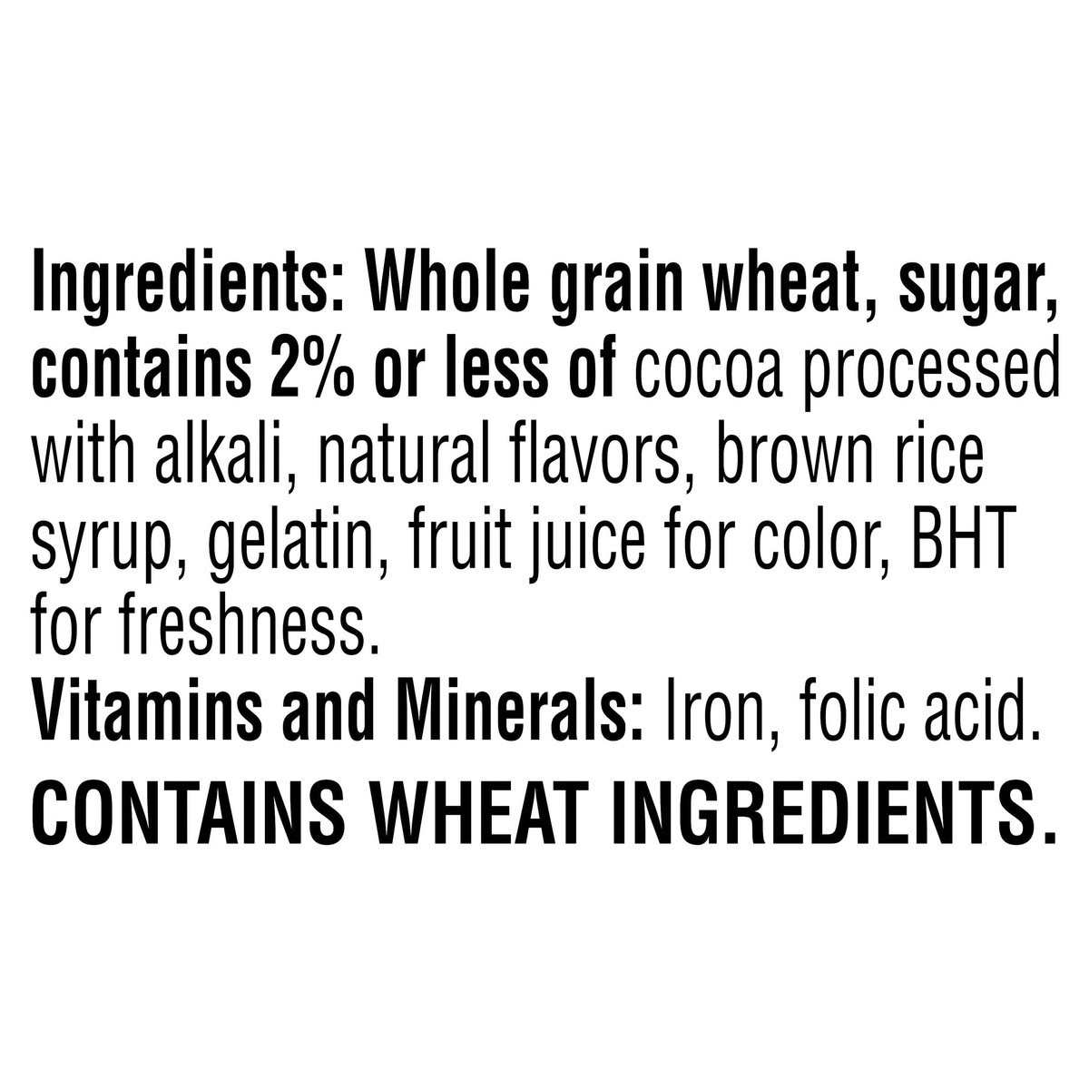 Whole Grain Wheat, Sugar, Contains 2% or Less of Cocoa Processed with Alkali, Natural Flavors, Brown Rice Syrup, Gelatin, Fruit Juice for Color, BHT for Freshness. Vitamins and Minerals: Iron, Folic A…