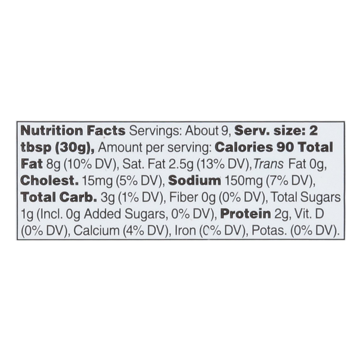 Mayonnaise (Soybean Oil, Water, Egg Yolks, Vinegar, Salt), Neufchatel Cheese (Pasteurized Milk and Cream, Skim Milk, Cheese Culture, Salt, Guar Gum, Carob Bean Gum, Xanthan Gum), Sour Cream (Pasteuriz…