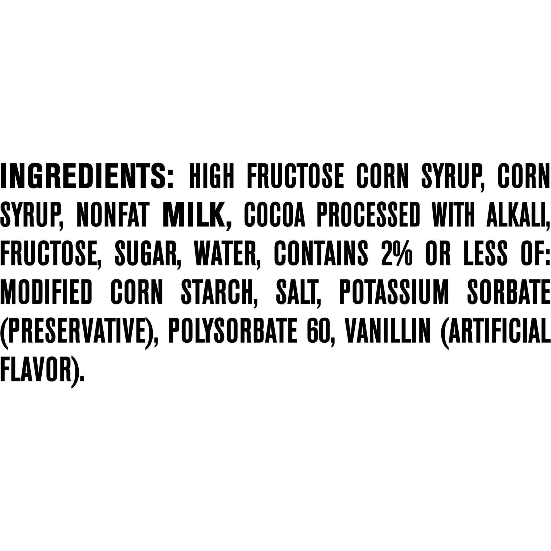 High Fructose Corn Syrup, Corn Syrup, Nonfat Milk, Cocoa Processed With Alkali, Fructose, Sugar, Water, Contains 2% Or Less Of: Modified Corn Starch, Salt, Potassium Sorbate (preservative), Polysorbat…