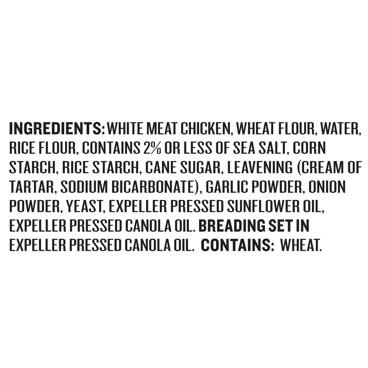 White Meat Chicken (Chicken Never Administered Antibiotics or Animal By-Products), Wheat Flour, Water, Rice Flour, Contains Less than 2% of the Following: Sea Salt, Corn Starch, Rice Starch, Cane Suga…