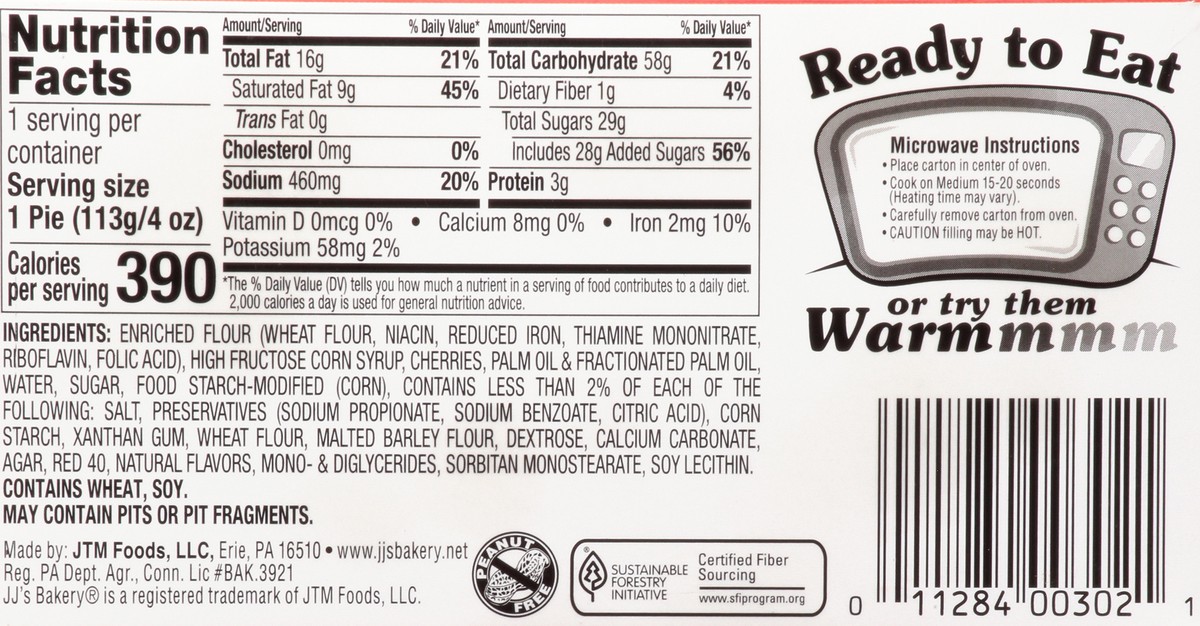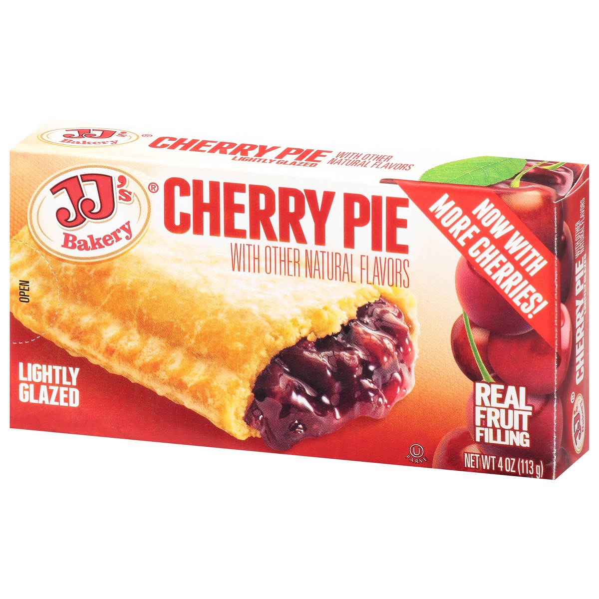 Cherry pie with other natural flavors. Peanut free. Real fruit filling. Now with more cherries! www.jjsbakery.net. Sustainable Forestry Initiative: Certified fiber sourcing. www.sfiprogram.org.