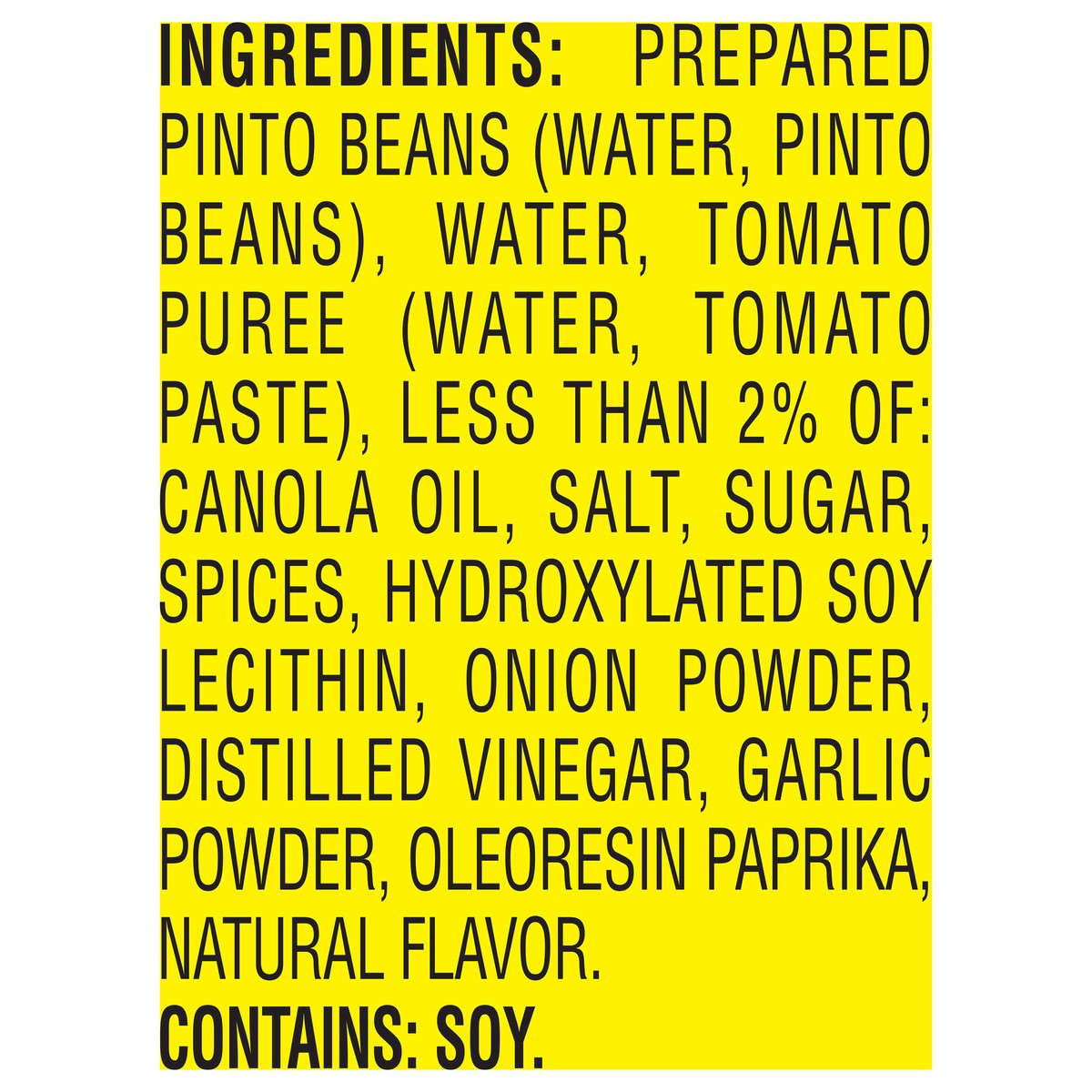 Prepared Pinto Beans (Water, Pinto Beans), Water, Tomato Puree (Water, Tomato Paste), Less than 2% of: Canola Oil, Salt, Sugar, Spices, Hydroxylated Soy Lecithin, Onion Powder, Distilled Vinegar, Garl…