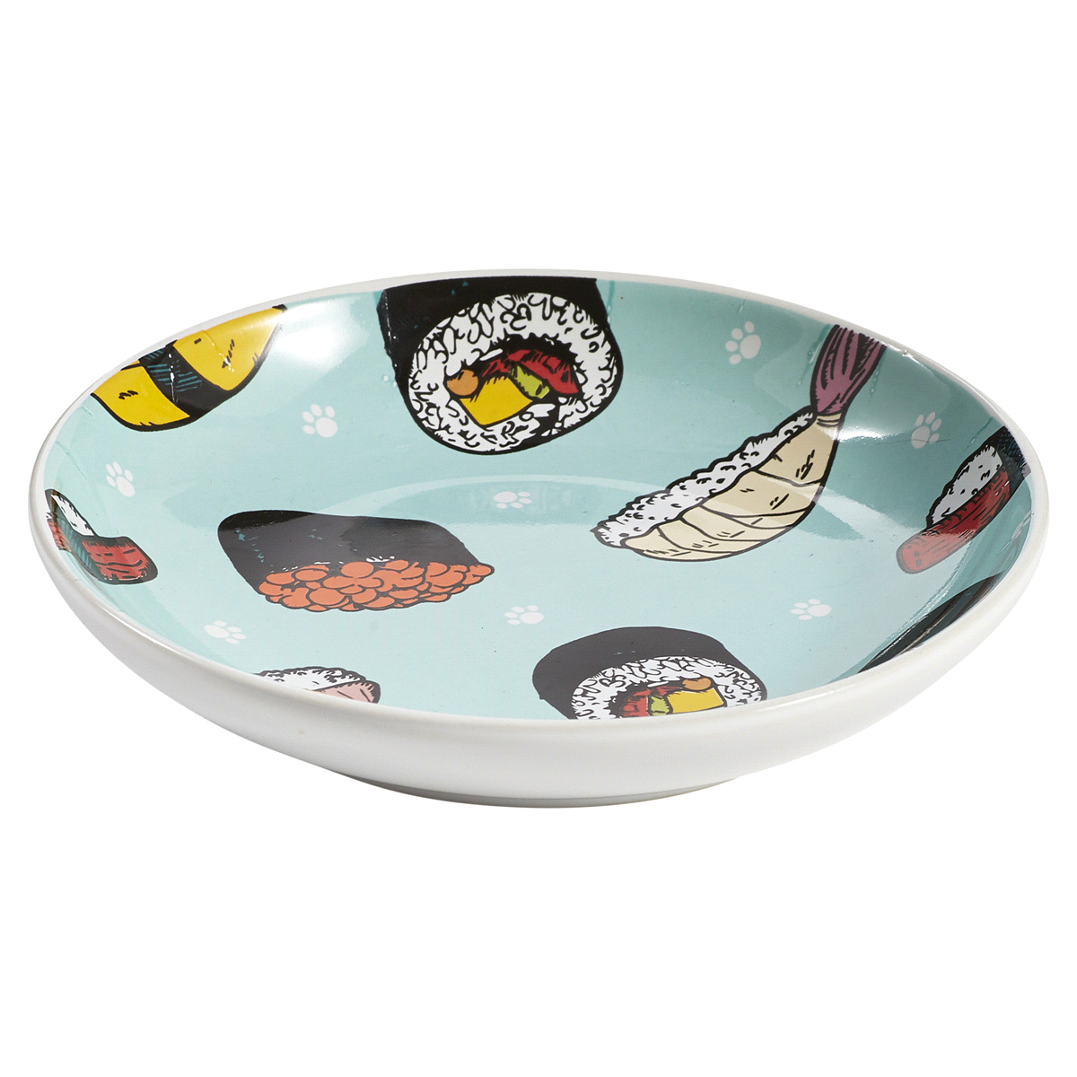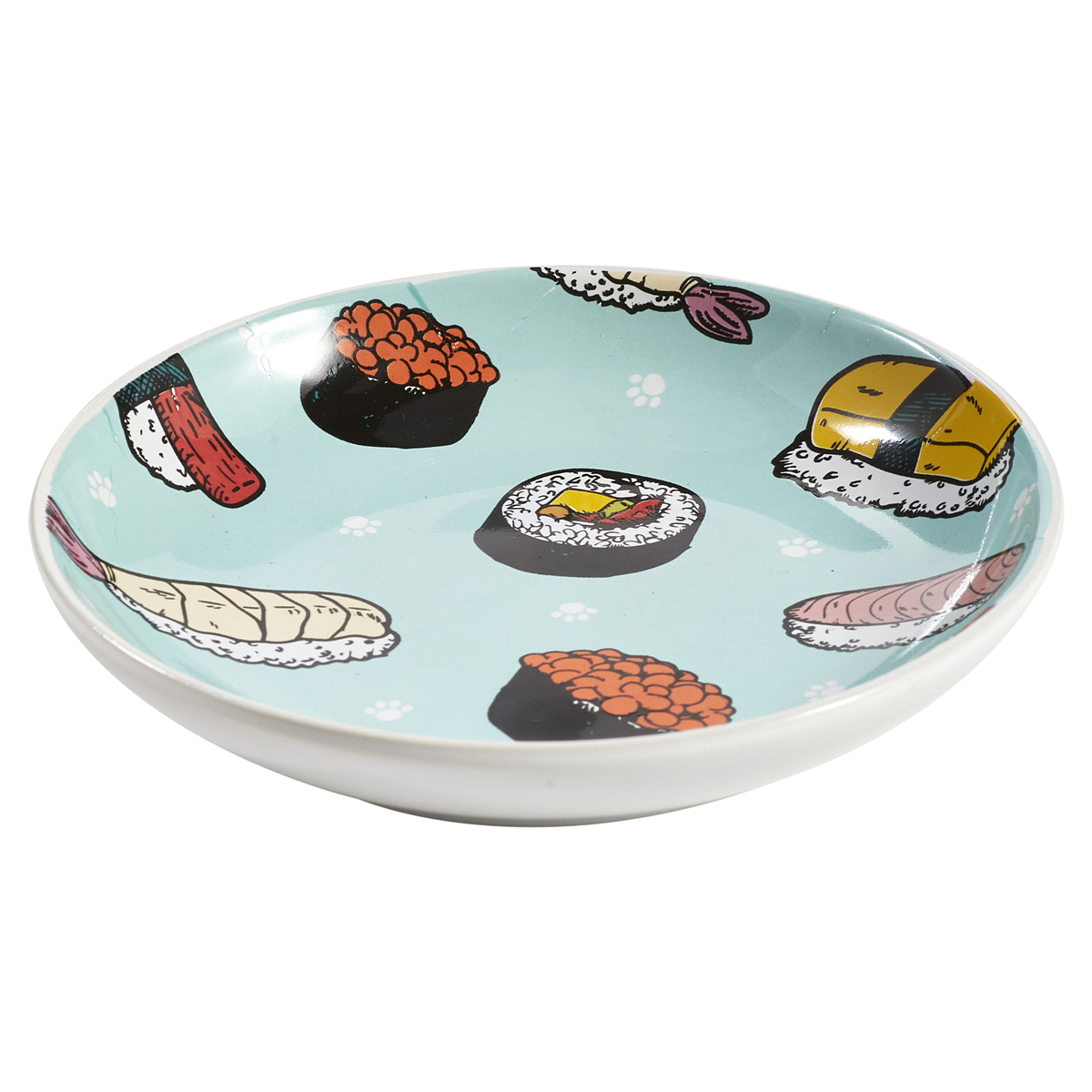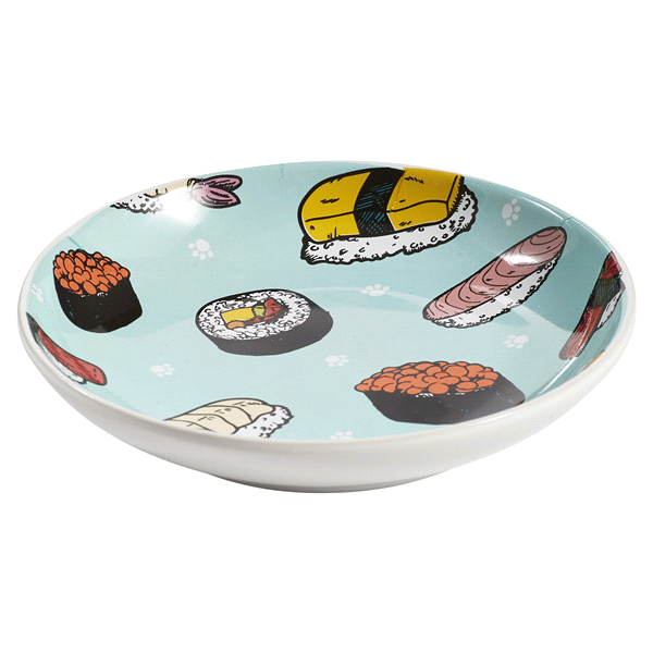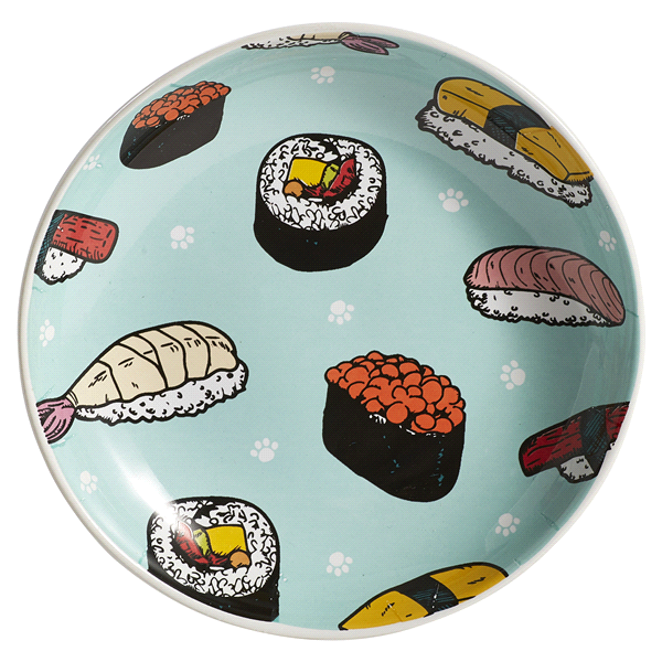 Give your pet a stylish design with dinner, with this sushi pet saucer. Featuring colorful sushi drawingswith a teal background.