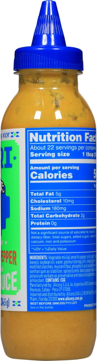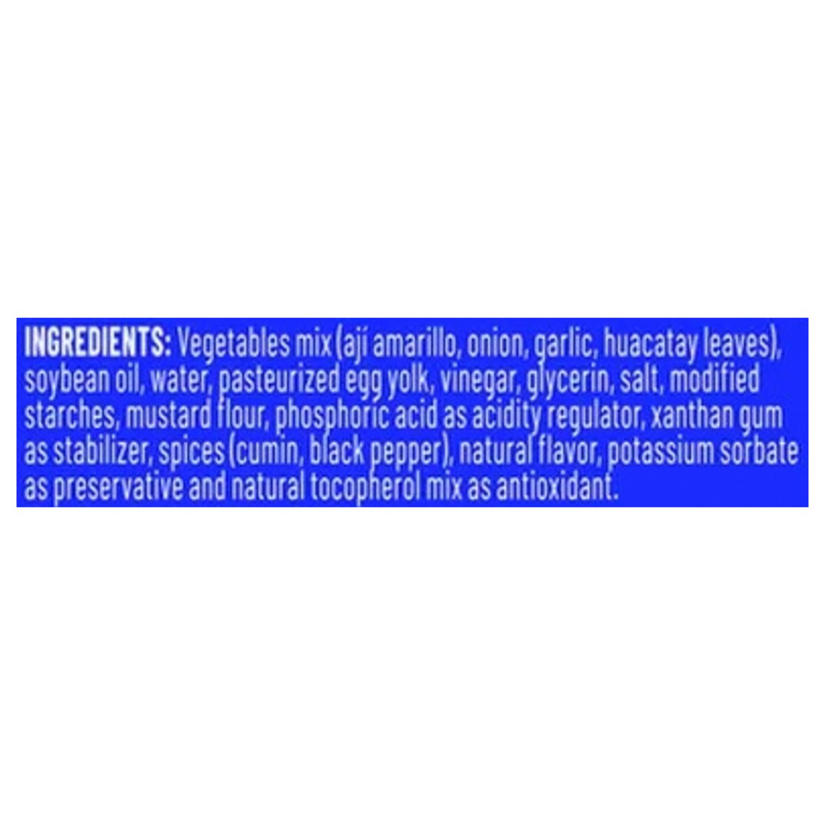 Vegetables Mix (Aji Amarillo, Onion, Garlic, Huacatay Leaves), Soybean Oil, Water, Pasteurized Egg Yolk, Vinegar, Glycerin, Salt, Modified Starches, Mustard Flour, Phosphoric Acid as Acidity Regulator…