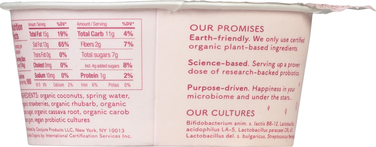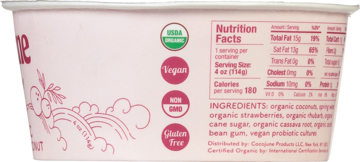 Organic Coconuts, Spring Water, Organic Strawberries, Organic Rhubarb, Organic Cane Sugar, Organic Cassava Root, Organic Carob Bean Gum, Vegan Probiotic Cultures. Our Cultures: Bifidobacterium Anim. S…