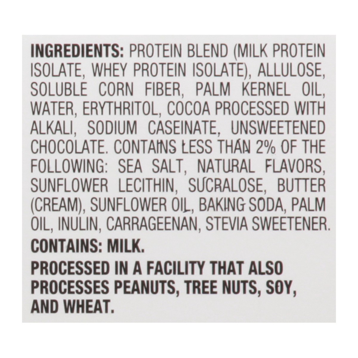 Protein Blend (Milk Protein Isolate, Whey Protein Isolate), Allulose, Soluble Corn Fiber, Palm Kernel Oil, Water, Erythritol, Cocoa Processed with Alkali, Sodium Caseinate, Unsweetened Chocolate, Cont…