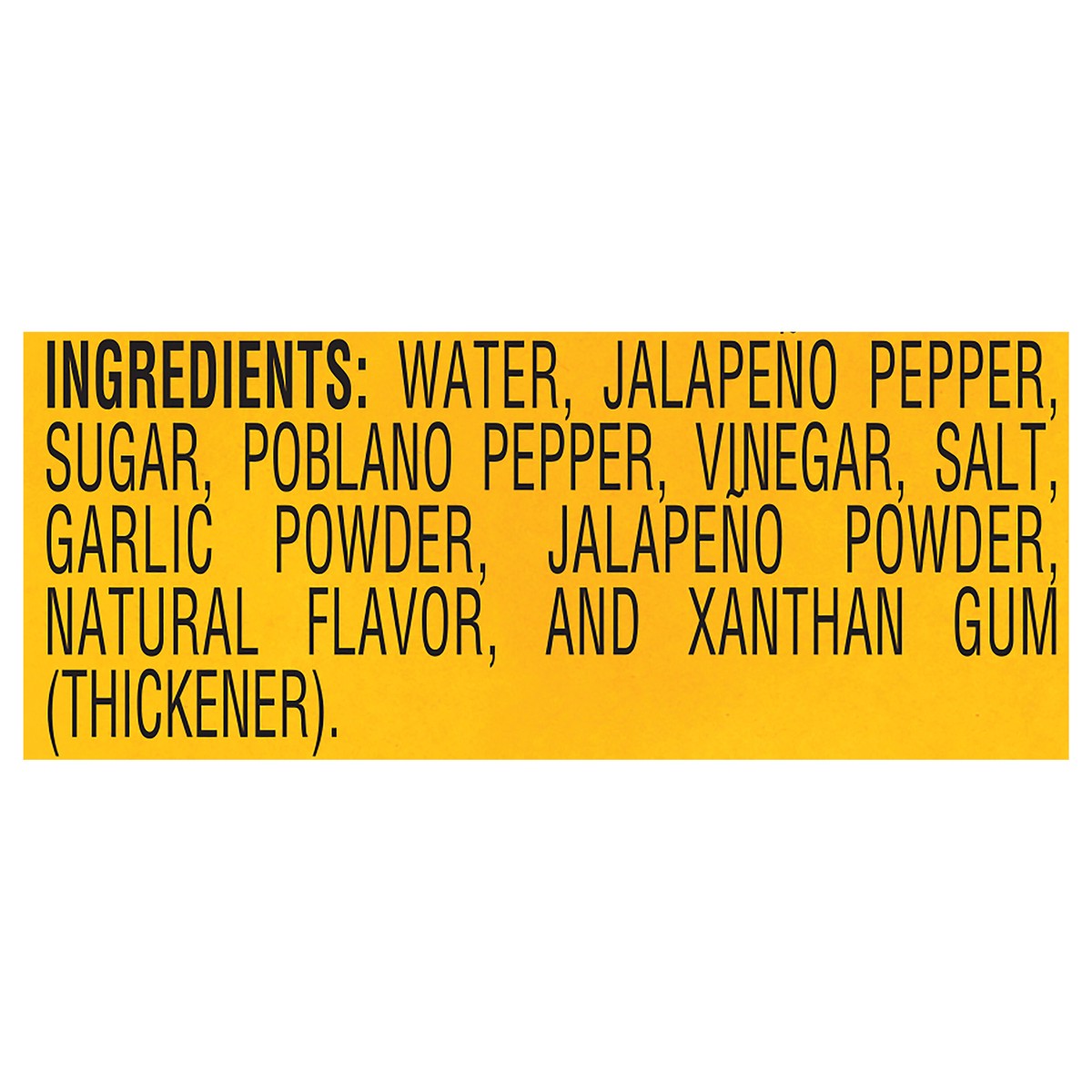Water, Jalapeno Pepper, Sugar, Poblano Pepper, Vinegar, Salt, Garlic Powder, Jalapeno Powder, Natural Flavor and Xanthan Gum (Thickener).