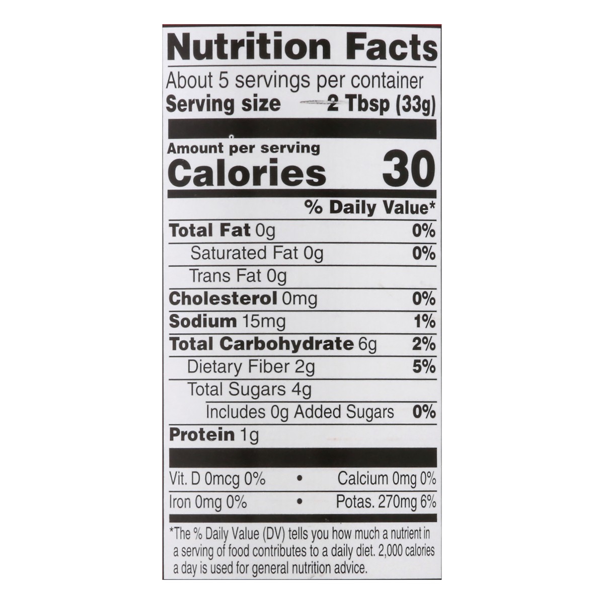 Per 2 Tbsp Serving: 30 calories; 0 g sat fat (0% DV); 15 mg sodium (1% DV); 4 g total sugars. Yourplusguarantee. harristeeter.com. Together in Education: Support your local schools. Together in Educat…