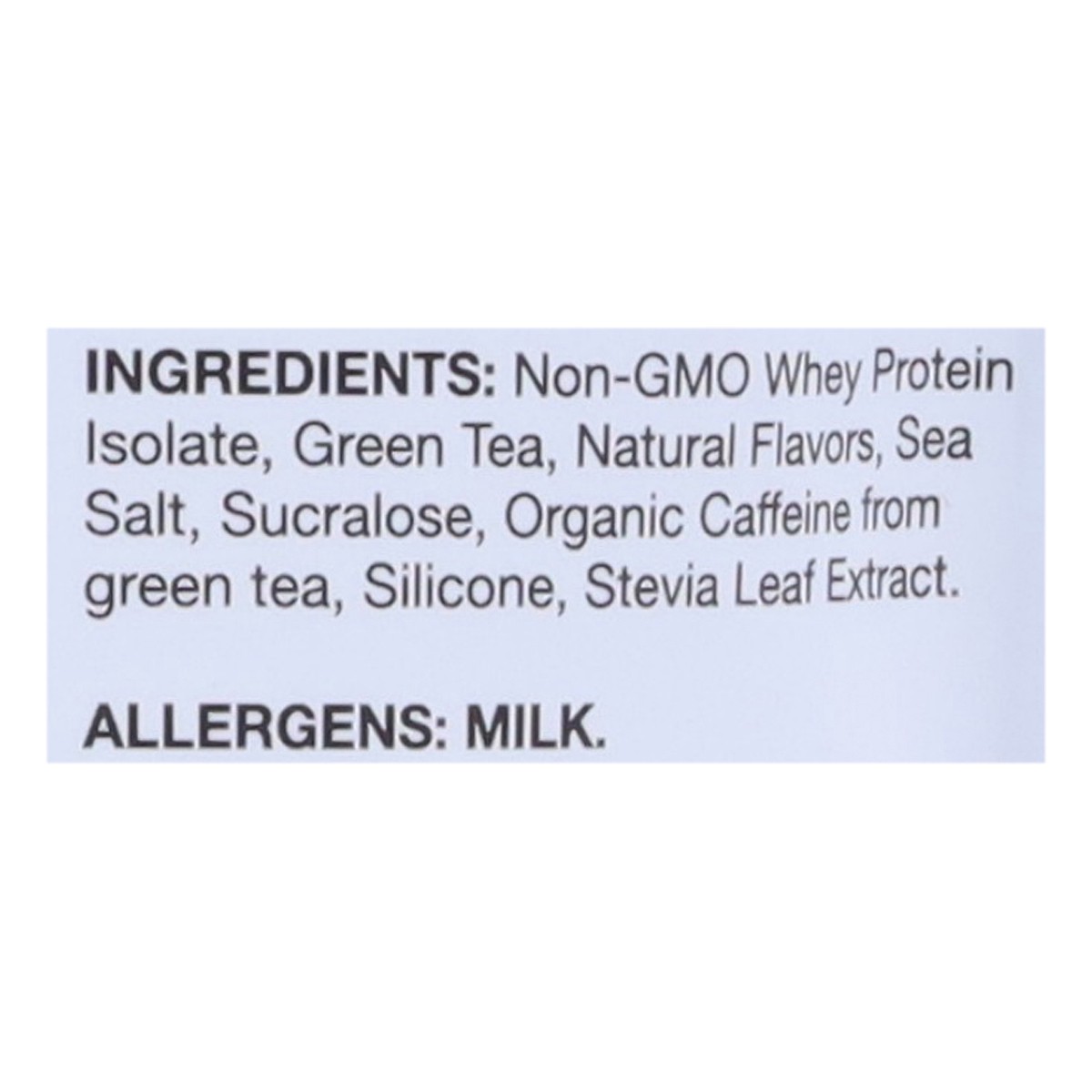 Non-GMO Whey Protein Isolate, Green Tea, Natural Flavors, Sea Salt, Sucralose, Organic Caffeine from Green Tea, Silicone, Stevia Leaf Extract.