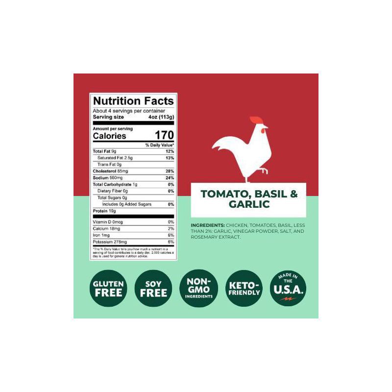CHICKEN, TOMATOES, BASIL, LESS THAN 2%: GARLIC, VINEGAR POWDER, SALT AND ROSEMARY EXTRACT.