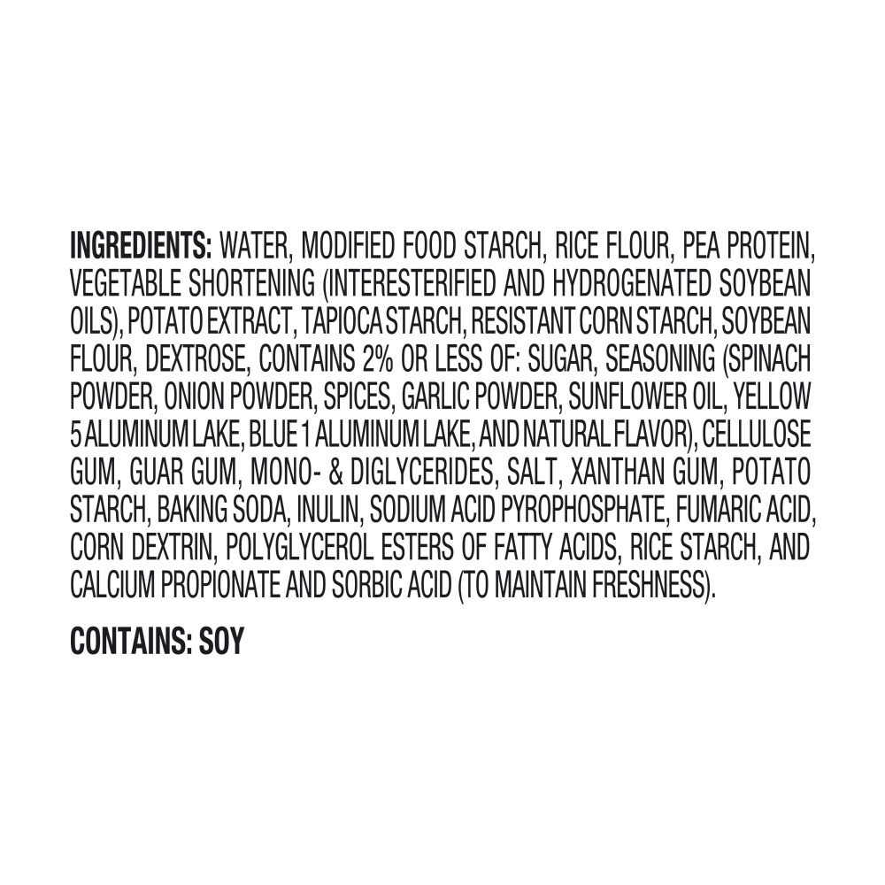 Water, Modified Food Starch, Rice Flour, Pea Protein, Vegetable Shortening (Interesterified and Hydrogenated Soybean Oils), Potato Extract, Tapioca Starch, Resistant Corn Starch, Soybean Flour, Dextro…