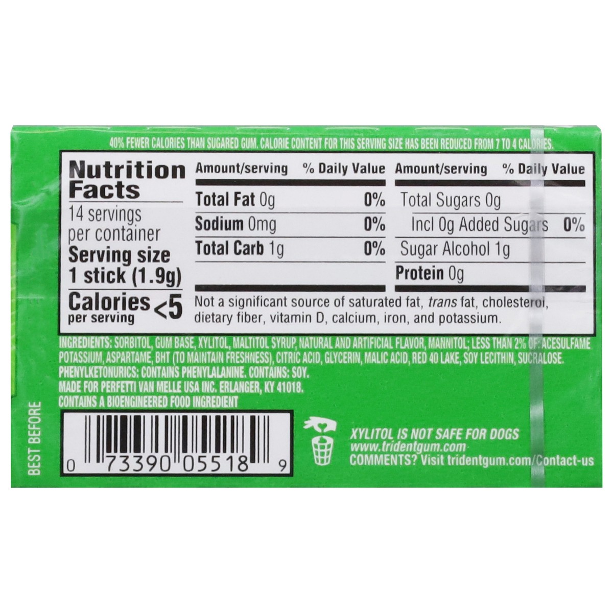 Artificial flavor. Sugar free. 40% fewer calories than sugared gum. Calorie content for this serving size has been reduced from 7 to 4 calories. Contains a bioengineered food ingredient. Refreshingly …