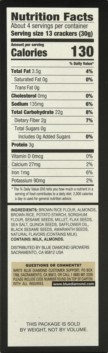 BROWN RICE FLOUR, ALMONDS, BROWN RICE, POTATO STARCH, SORGHUM FLOUR, SESAME SEEDS, MILLET, FLAX SEEDS, SEA SALT, QUINOA SEEDS, SAFFLOWER OIL, BLACK SESAME SEEDS, AMARANTH SEEDS, NATURAL FLAVORS (CONTA…
