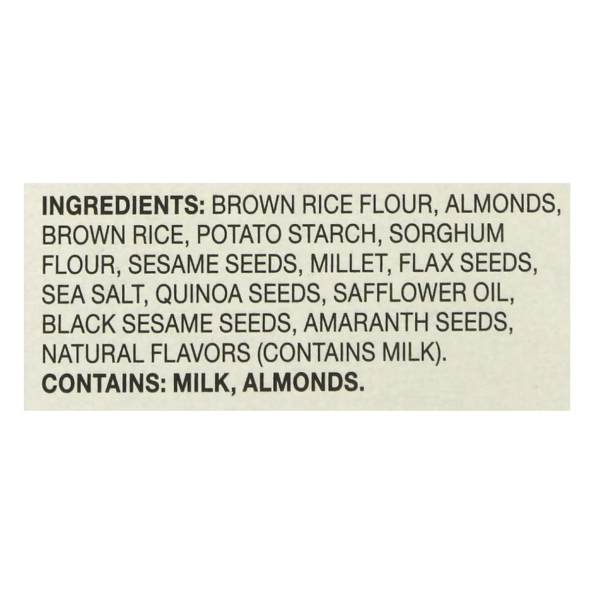 Brown Rice Flour, Almond Brown Rice, Potato Starch, Sorghum Flour, Sesame Seeds, Millet, Flax Seeds, Sea Salt, Quinoa Seeds, Safflower Oil, Black Sesame Seeds, Amaranth Seeds, Natural Flavors (Contain…
