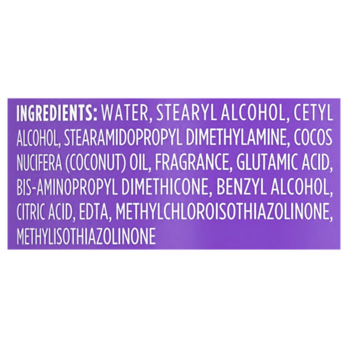 Water, Stearyl Alcohol, Cetyl Alcohol, Stearamidopropyl Dimethylamine, Cocos Nucifera (Coconut) Oil, Fragrance, Glutamic Acid, Bis-Aminopropyl Dimethicone, Benzyl Alcohol, Citric Acid, EDTA, Methylchl…