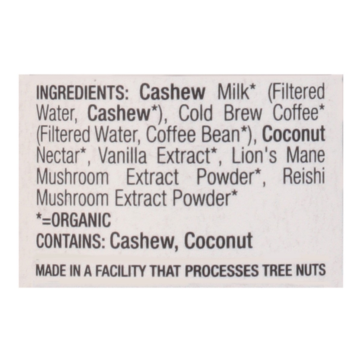 Cashew Milk (Organic) (Filtered Water, Cashew (Organic)), Cold Brew Coffee (Organic) (Filtered Water, Coffee Bean (Organic)), Coconut Nectar (Organic), Vanilla Extract (Organic), Lion's Mane Mushroom …