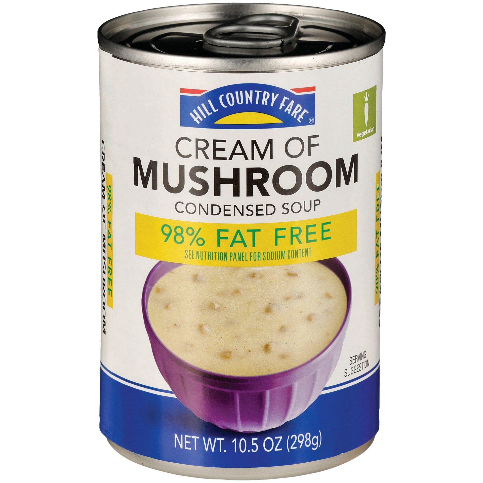 It's the classic you know and love — only 98% fat-free! Hill Country Fare Cream of Mushroom Condensed Soup is tasty for lunch and also comes in handy as a saucy base for many casseroles. Plus, it's qu…