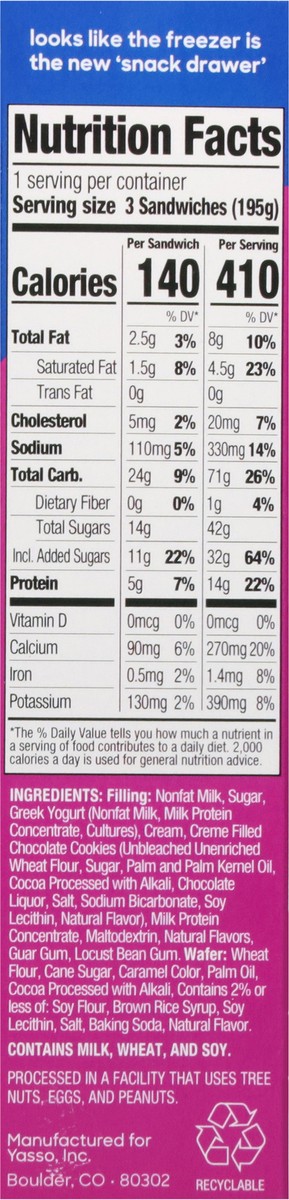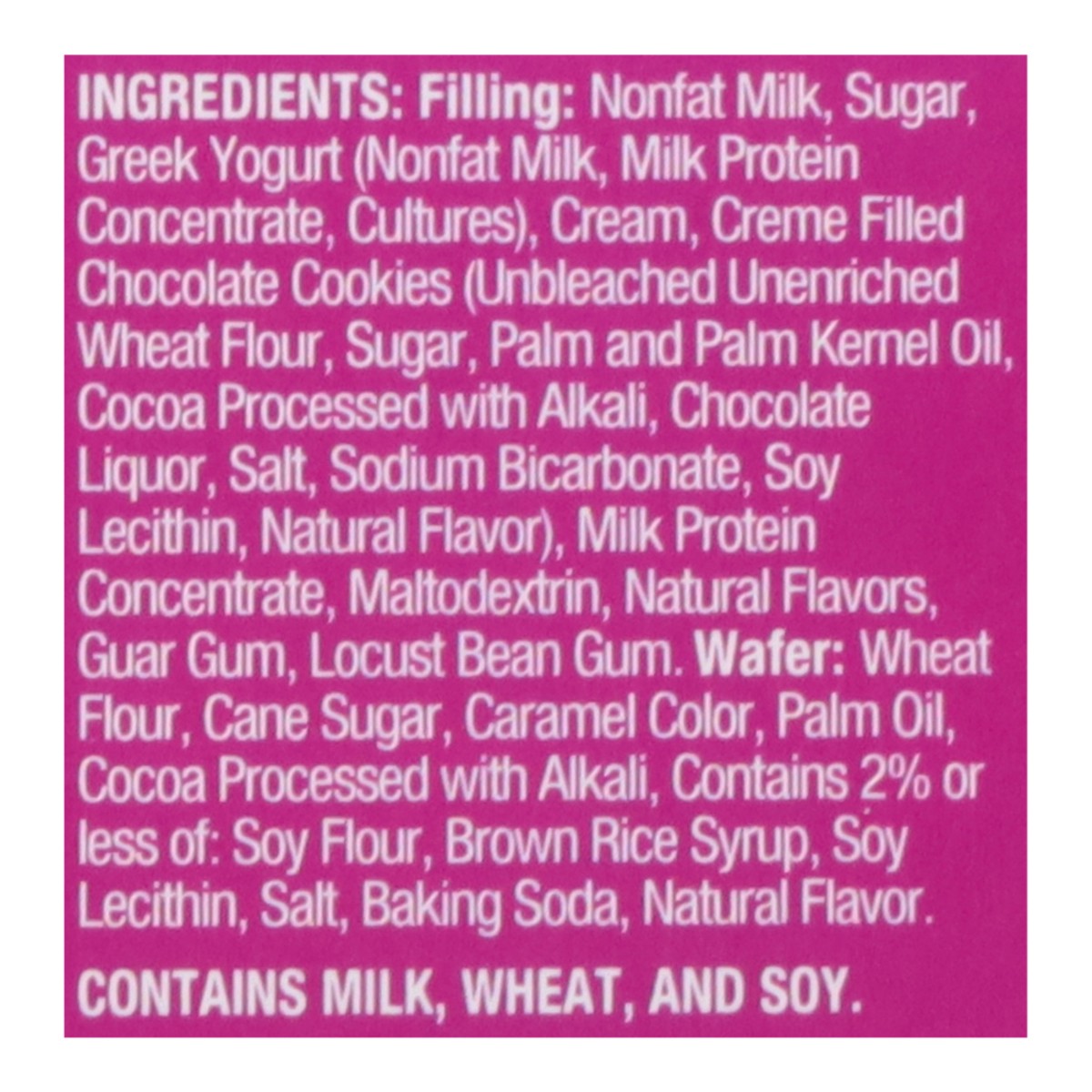 Filling: Nonfat Milk, Sugar, Greek Yogurt (Nonfat Milk, Milk Protein Concentrate, Cultures), Cream, Creme Filled Chocolate Cookies (Unbleached Unenriched Wheat Flour, Sugar, Palm and Palm Kernel Oil, …
