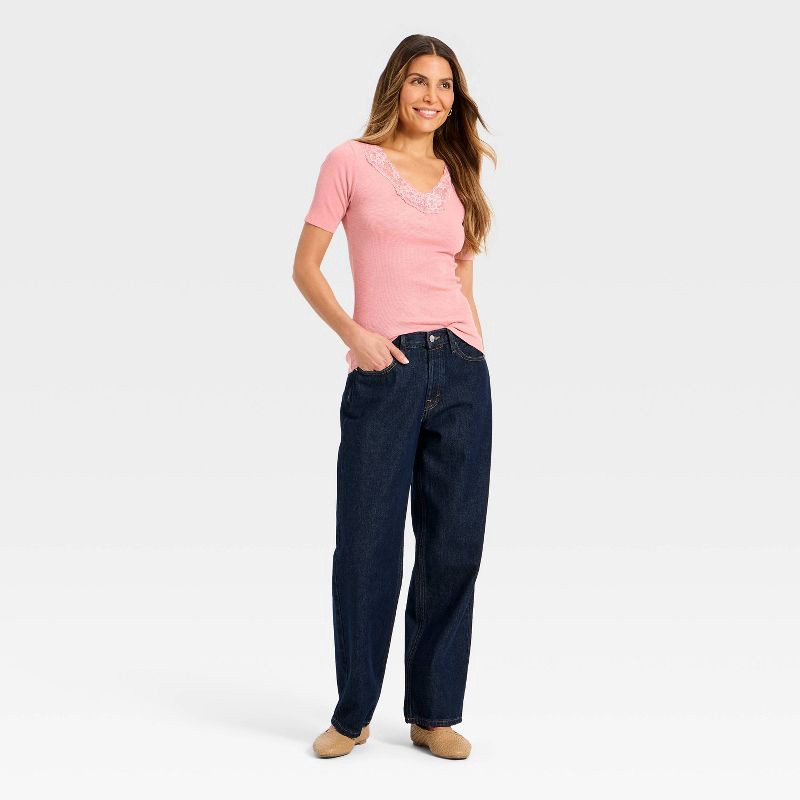 Women's Short Sleeve Lace V-Neck T-Shirt - Universal Thread™ Pink S