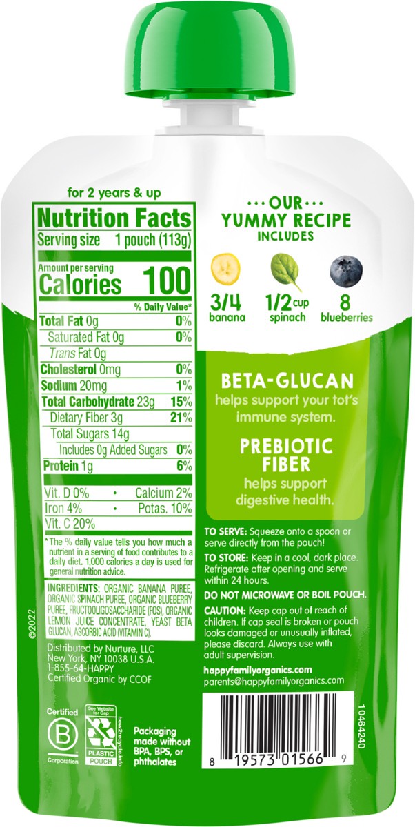 ORGANIC BANANA PUREE, ORGANIC SPINACH PUREE, ORGANIC BLUEBERRY PUREE, FRUCTOOLIGOSACCHARIDE (FOS), ORGANIC LEMON JUICE CONCENTRATE, YEAST BETA GLUCAN, ASCORBIC ACID (VITAMIN C).