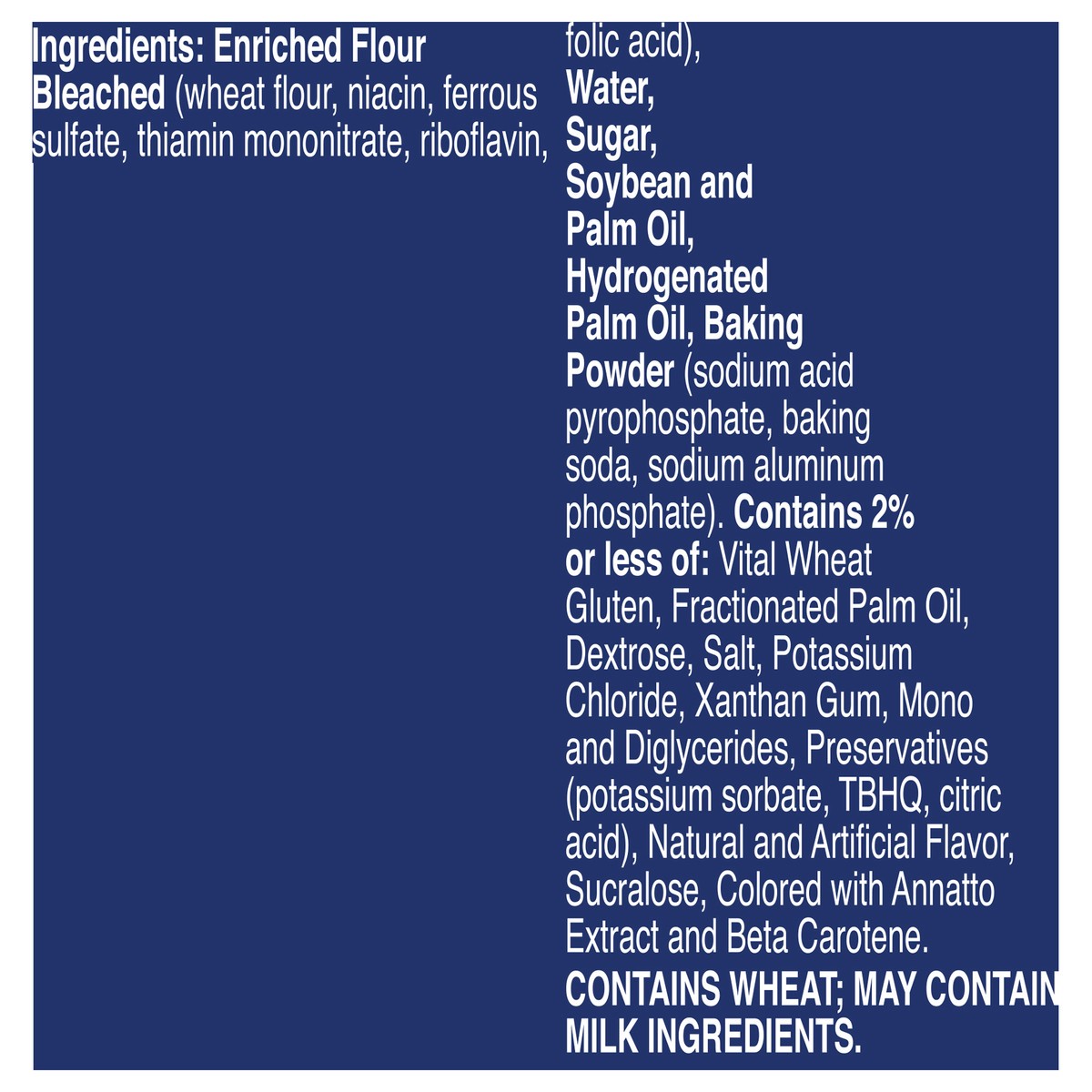 Enriched Flour Bleached (Wheat Flour, Niacin, Ferrous Sulfate, Thiamin Mononitrate, Riboflavin, Folic Acid), Water, Sugar, Soybean and Palm Oil, Hydrogenated Palm Oil, Baking Powder (Sodium Acid Pyrop…