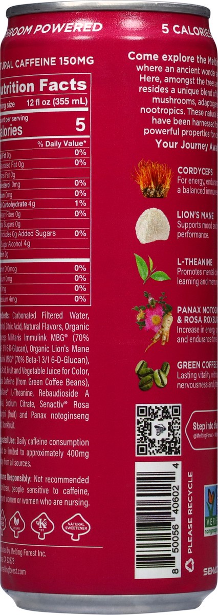 Carbonated Filtered Water, Erythritol, Citric Acid, Natural Flavors, Organic Cordyceps Militaris Immulink Mbg (70% Beta-1 3/1 6-D-Glucan), Organic Lion''s Mane Immulink Mbg (70% Beta-1 3/1 6-D-Glucan)…