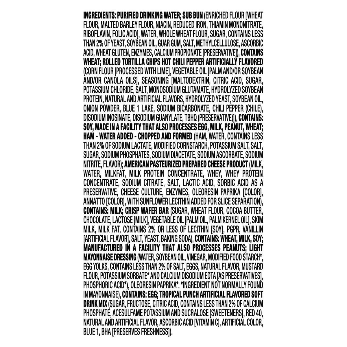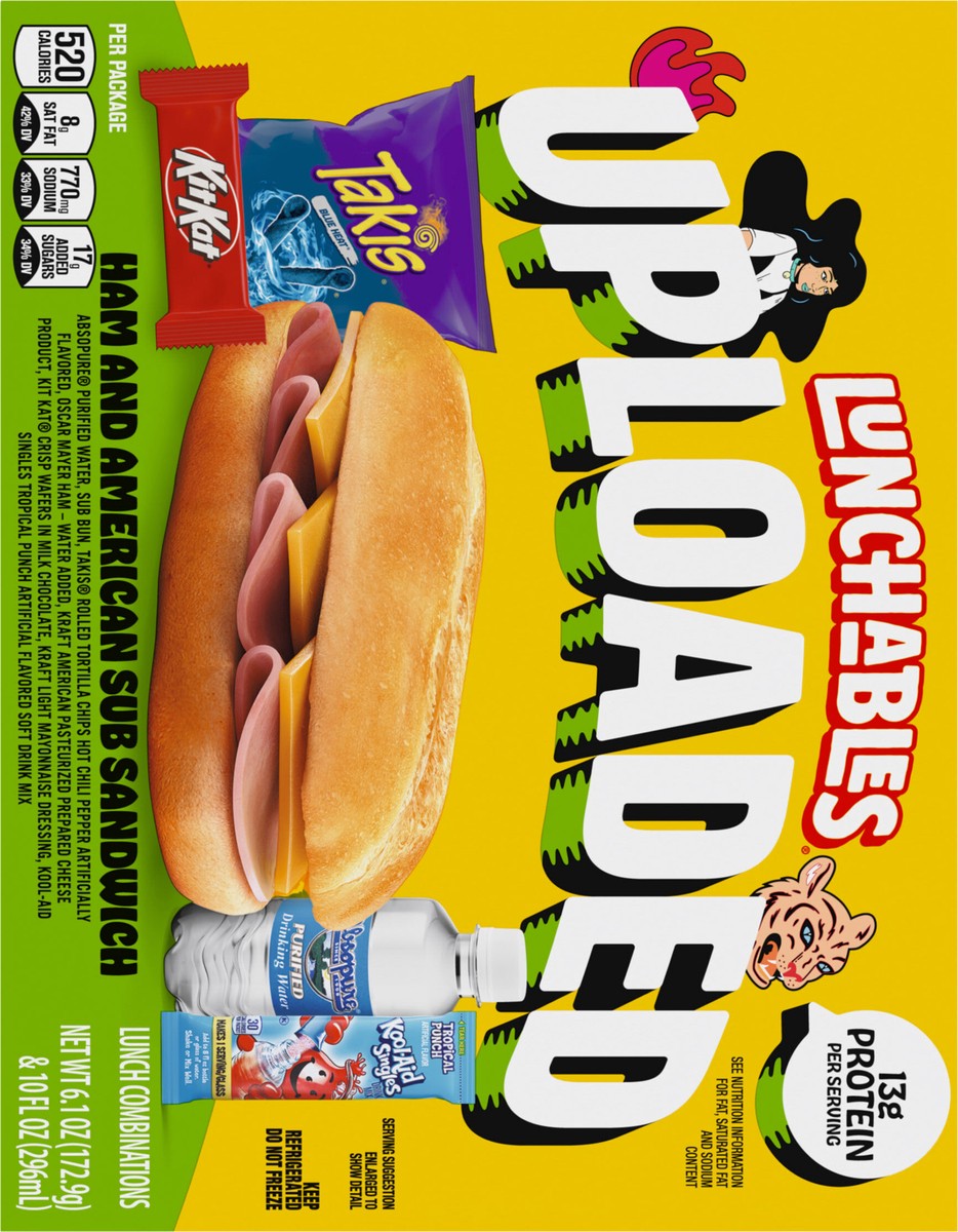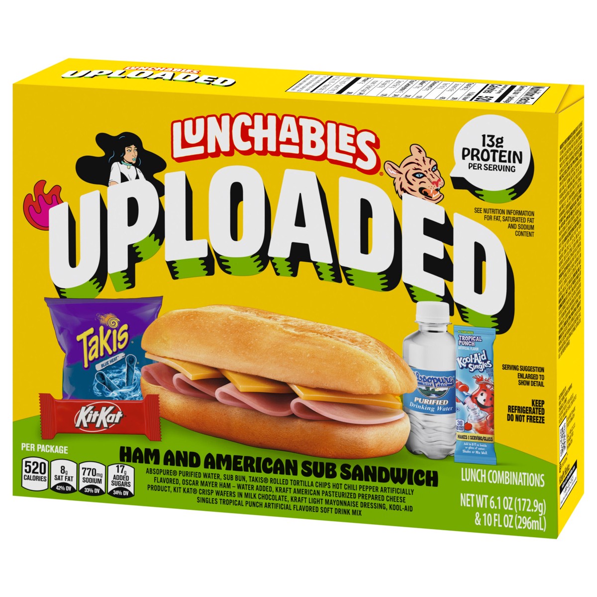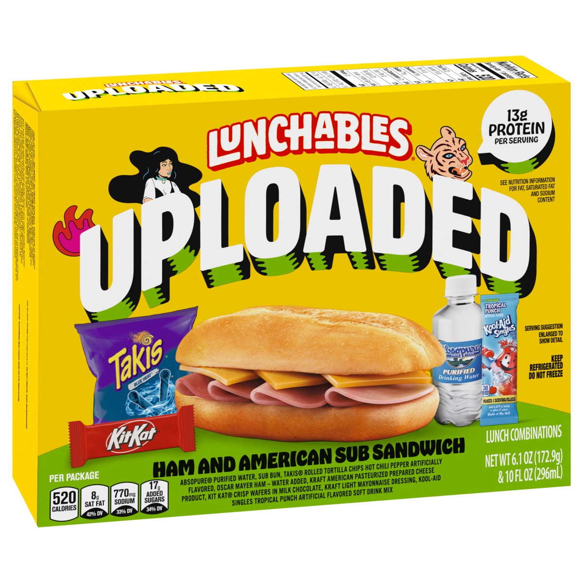 - One 16.1 oz Lunchables Uploaded Ham and American Sub Sandwich Snack Kit with Takis, Kit Kat, Water and Kool-Aid Powdered Drink Mix Snack Kit