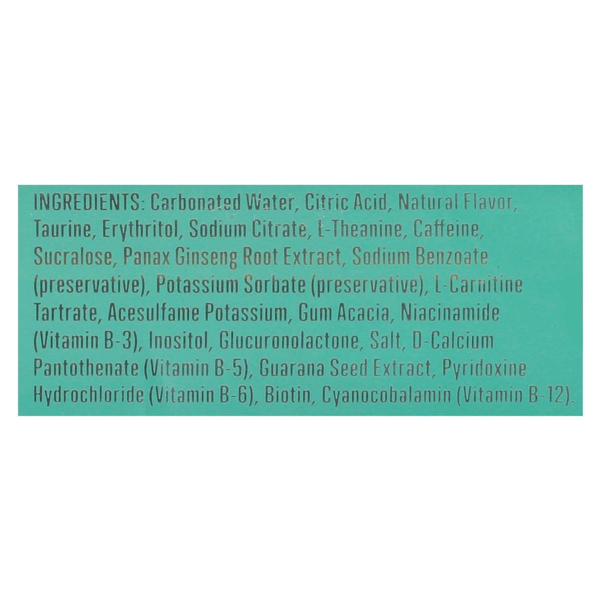 Carbonated Water, Citric Acid, Natural Flavor, Taurine, Erythritol, Sodium Citrate, L-Theanine, Caffeine, Sucralose, Panax Ginseng Root Extract, Sodium Benzoate (Preservative), Potassium Sorbate (Pres…