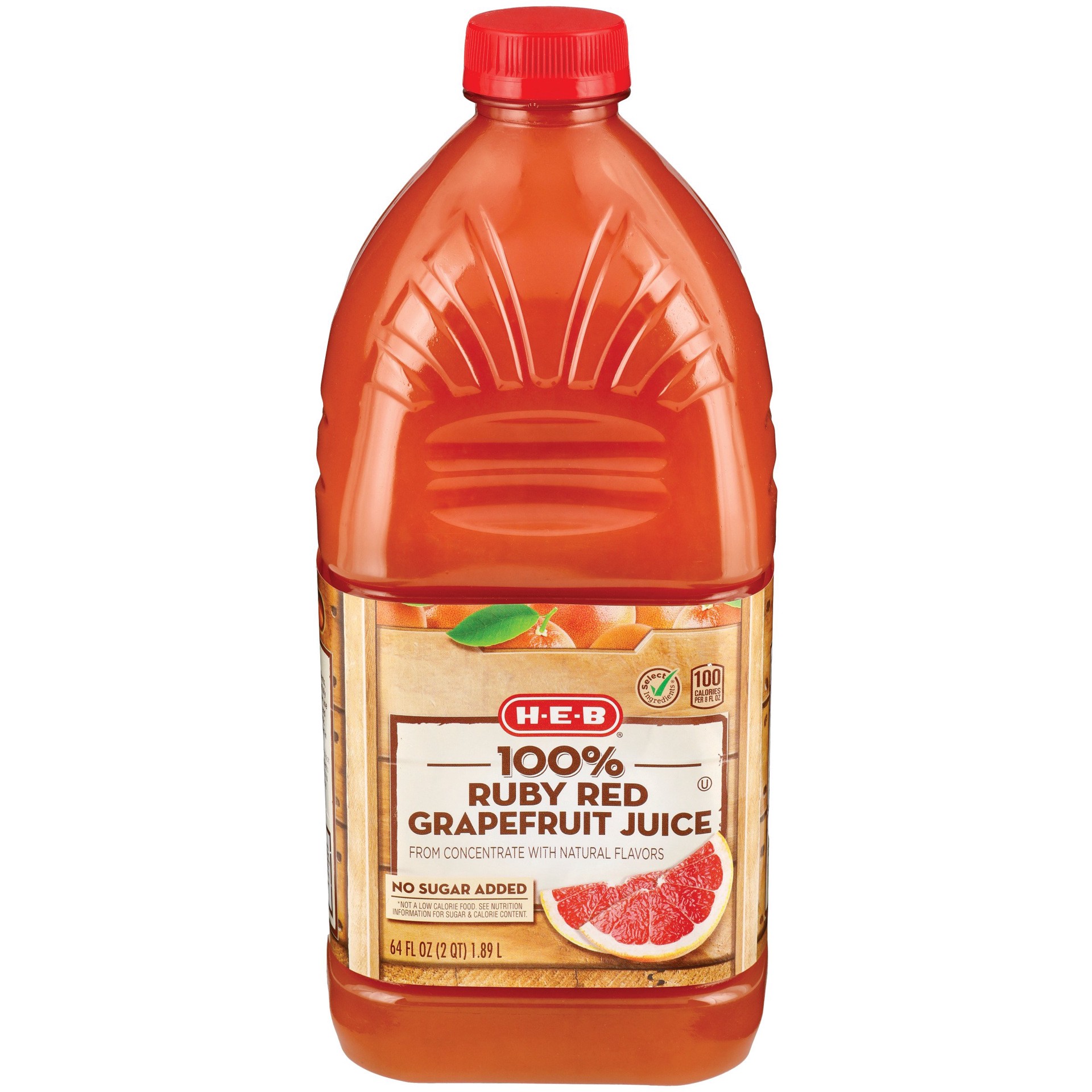 H-E-B 100% Ruby Red Grapefruit Juice has no sugar added. Enjoy the deliciously sweet-tart taste in every sip.
