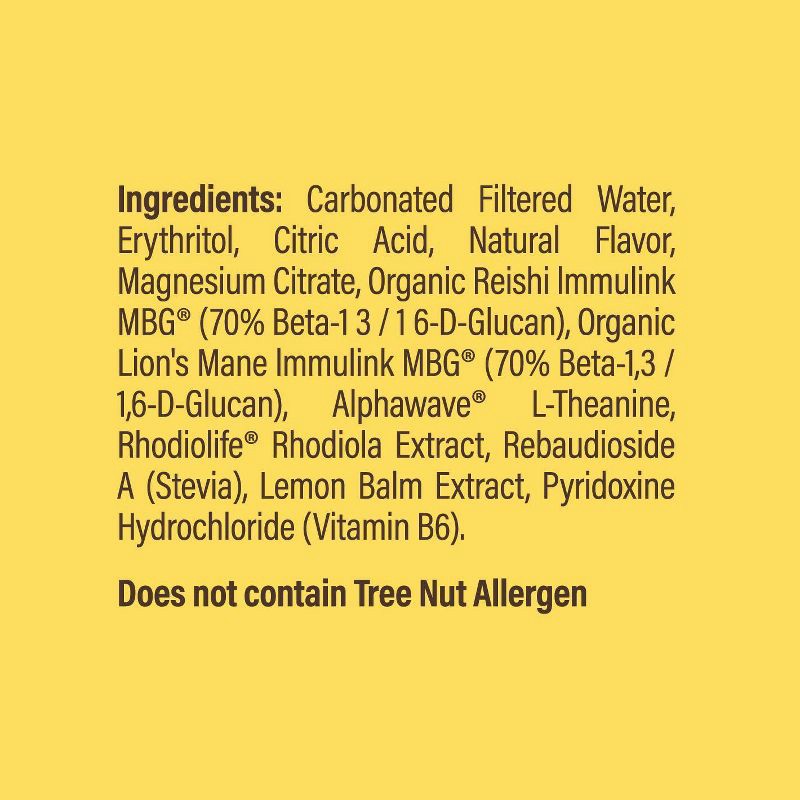 Carbonated Filtered Water, Erythritol, Natural Flavors, Citric Acid, Fruit and Vegetable Juice for Color, Malic Acid, Magnesium Citrate, Organic Reishi Immulink MBG (70% Beta-1,3/1,6-D-Glucan), Organi…