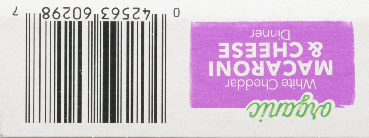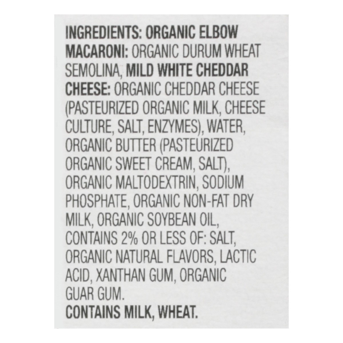 Organic Elbow Macaroni: Organic Durum Wheat Semolina, Mild White Cheddar Cheese: Organic Cheddar Cheese (Pasteurized Organic Milk, Cheese Culture, Salt, Enzymes), Water, Organic Butter (Pasteurized Or…