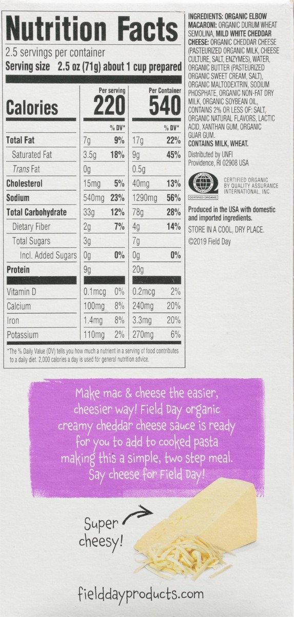 Field Day Organic Deluxe White Cheddar Macaroni & Cheese will have your kids coming back for more! Experience the tasty, creamy, organic white cheddar cheese sauce by adding to cooked pasta for a supe…