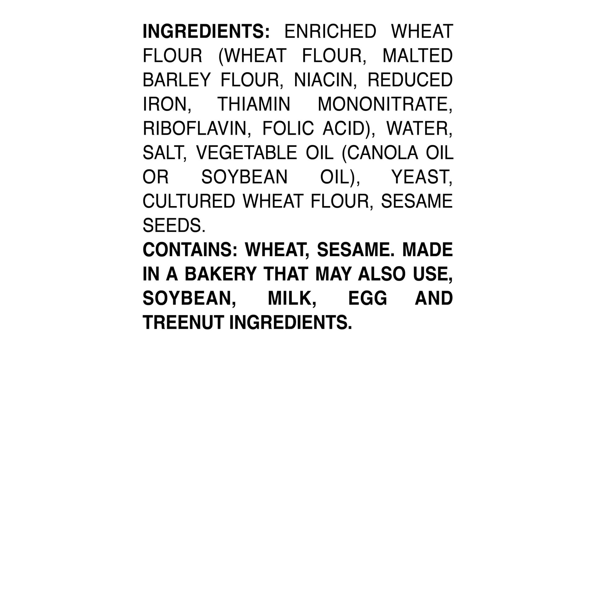 Enriched Wheat Flour (Wheat Flour, Malted Barley Flour, Niacin, Reduced Iron, Thiamin Mononitrate, Riboflavin, Folic Acid), Water, Salt, Vegetable Oil (Canola Oil or Soybean Oil), Yeast, Cultured Whea…